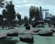 - Im gesamten Park findet man Anspielungen auf andere GTA-Spiele. Die bekannteste ist wohl das halb abgebaute Breakdancer-Karussell, dessen Hintergrund ein Foto des Vinewood-Sign, zusammen mit der Skyline von Los Santos zeigt. Auch eine Hydra und eine Shamal sind auf dem Bild zu sehen. Ein Miniaturmodell vom World’s Largest Pecker ist ebenfalls auf dem Minigolfplatz zu finden. Auch ein Miniaturmodell des Ocean View Hotel und eines Leuchtturms stellen Hindernisse auf dem Platz dar.