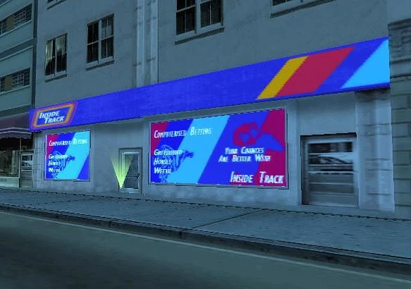 - Bereits in Vice City sollte das Wettbüro ursprünglich betretbar sein, möglicherweise als Bestandteil von Tommy Vercettis Raubüberfällen. Die Texturen wurden nahezu 1:1 in San Andreas übernommen.