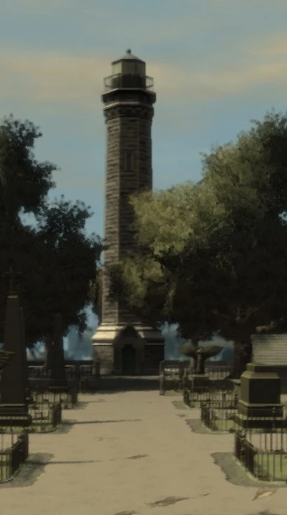 Der Leuchtturm von Liberty City aus Grand Theft Auto IV und Grand Theft Auto: Chinatown Wars steht im Norden von Colony Island, einer kleinen Insel inmitten des Humboldt River, nahe der Algonquin Bridge, hinter dem Friedhof.