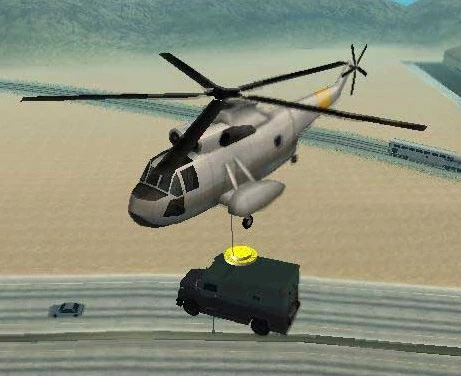 Lenk den schweren Hubschrauber nach Südosten. Auf dem Industriegebiet in Linden Side bzw. Rockshore East parkt der gesuchte Panzerwagen. Manövrier deinen Leviathan so über den Bank-Van, dass der gelbe Elektromagnet das Dach des Fahrzeugs berührt. Sobald der Wagen fest am Stahlseil hängt, kannst du aufsteigen und musst den Van jetzt nur noch zum Flugzeugfriedhof in die Wüste transportieren und heil absetzen. Der Transport-Heli wird ebenfalls dort abgestellt (und bleibt dauerhaft vorhanden – jedoch ohne Magnet).