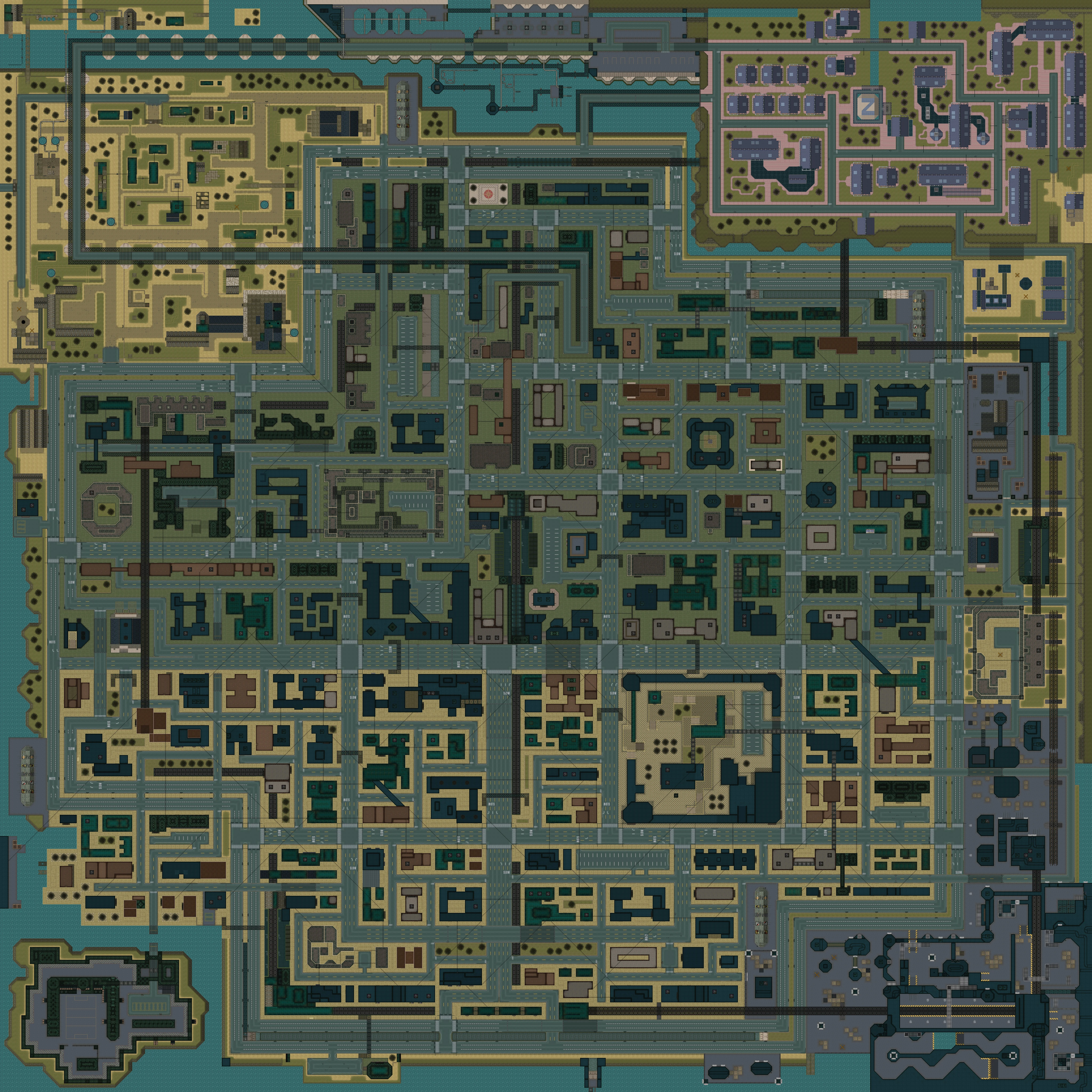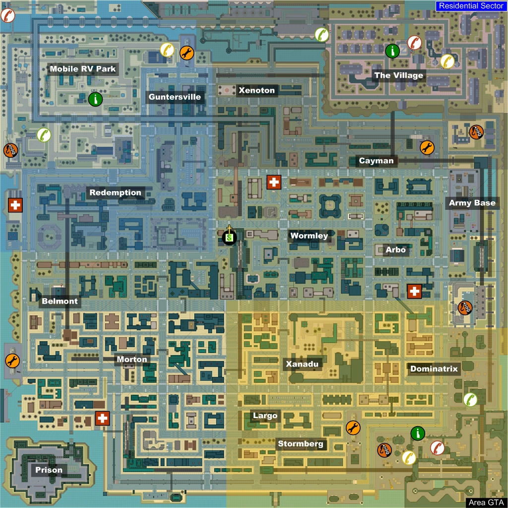Se encuentra formado por bloques de pisos donde se pueden encontrar pequeñas tiendas como supermercados o bares. El extremo norte y oeste está formado principalmente por zonas más relacionadas con el campo, como el parque de carabanas de los Cuellos rojos, un complejo de casas unifamiliares propiedad de la Zaibatsu Corporation y una base militar. Al sureste se encuentran unas grandes instalaciones científicas donde trabajan los Científicos SRS mientras que al suroeste se encuentra la prisión de la ciudad.