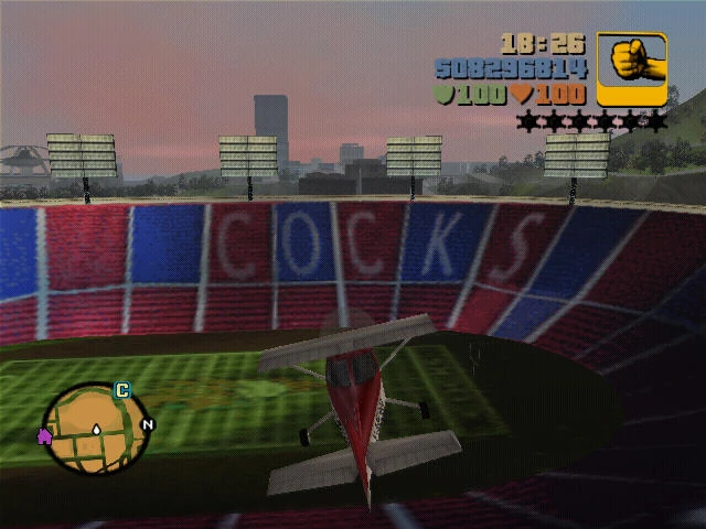 Los Liberty Cocks son un equipo de fútbol de Liberty City. Este easter egg se encuentra en el Bush Stadium. Para verlo hace falta un Flatbed y un Mule. Primero debemos estacionar el Flatbed en la entrada del estadio (de ésta manera: <--) y luego el Mule (de esta manera: -->). Ahora tentremos que saltar en la parte baja del Flatbed e ir escalando niveles de altura hasta poder tener una vista panorámica de los asientos del estadio, que dirán "COCKS".