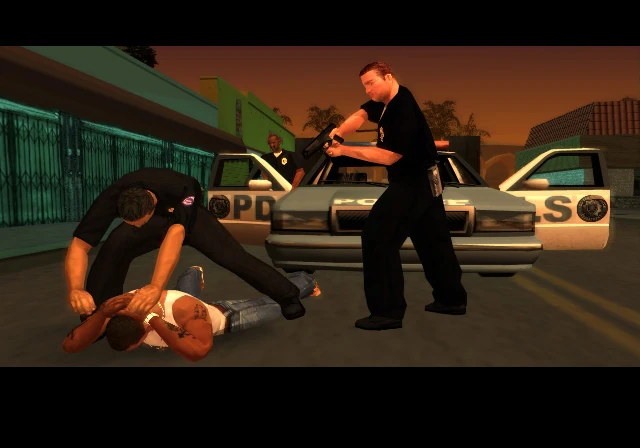 Carl Johnson, tras enterarse de la muerte de su madre, vuelve de Liberty City y sale del aeropuerto para tomar un taxi y volver a su antigua casa, pero a pocos metros de llegar, una patrulla intercepta el taxi y lo detiene. De ella bajan Pulaski y Hernández,y apuntan con sus pistolas al auto, luego baja del vehículo Tenpenny, que con un altavoz ordena a CJ salir del taxi con las manos arriba y luego ponerse de rodillas para que sus compañeros le hagan una inspección. CJ obedece y Hernández lo esposa y le quita el dinero que llevaba, para, poseriormente darselo a Tenpenny, al verlo acusa a Carl de tener dinero ilegal. Carl reclama por su dinero pero Tenpenny ignora eso y le da la bienvenida, quien esta sujeto por Pulaski y Hernández y posteriormente es subido al vehículo policial. Pulaski ahuyenta al taxista, y de esa manera Carl pierde su maleta.