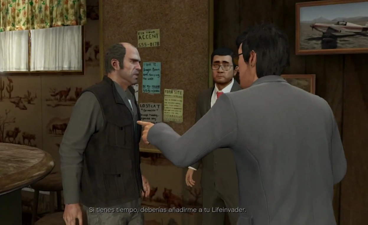 Tao comienza a bailar y a decir que está colocado, uno de los hombres sentados en el bar dice que todos hablan otro idioma y que lo hagan entre ellos. Tao abraza a Trevor, le dice que lo debería añadir como amigo en Life Invader y comienza a bailar y cantar. Trevor lo toma como una broma y se larga del lugar. El traductor lo persigue y lo detiene en la entrada del bar, diciéndole que lo matarán si se marcha. Trevor se muestra indiferente y el traductor le dice que ellos están interesados por Industrias Trevor Philips y que si funciona, se asociaran y generarán mucho dinero.