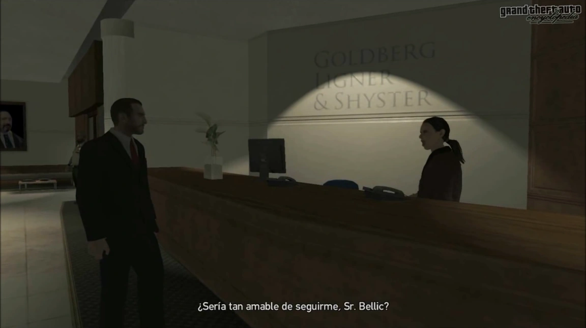 Niko se viste elegantemente y se dirige a Goldberg, Ligner y Shyster. Una vez allí, toca el timbre y anuncia ante el altavoz que viene para una entrevista. Karen, con un micrófono, lo saluda y le abre la puerta, pidiéndole que pase a recepción. Una vez allí, Karen le dice a Niko que verá si Goldberg está disponible. Tras anunciarle a Goldberg la llegada de Niko y luego de que este acepte la entrevista, Karen le pide que la siga hasta la oficina. Acto seguido, sale del escritorio y cruza un pasillo a la derecha, rumbo a la oficina de Goldberg.