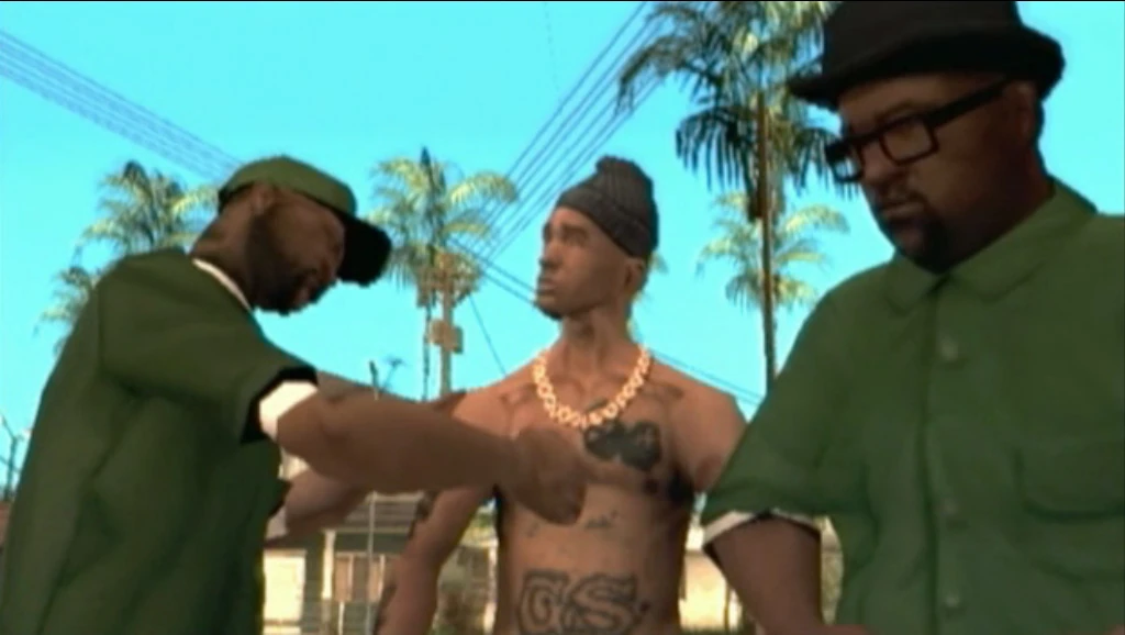 Freddy | Freddy es un miembro de los Los Santos Vagos y ex-amante de Loc en la cárcel. Tras su salida de la cárcel Jeffrey quiere venganza sobre un pandillero de los Santos Vagos llamado Freddy que vive en Los Flores por unas "rimas robadas en la cárcel", a lo que solo CJ lo ayuda. Tras llegar enfrente de la casa de Freddy, un furioso OG Loc lo llama por la puerta a que lo abra para que le devuelva las rimas, pero Freddy contesta que "lo suyo" solo fue en la cárcel y que aquí tiene mujeres de sobra. Tras sentirse insultado, Loc y CJ empiezan a perseguirlo con unas motos hasta llegar a una cancha de baloncesto, donde los dos lo matan junto a sus compañeros Vagos. |