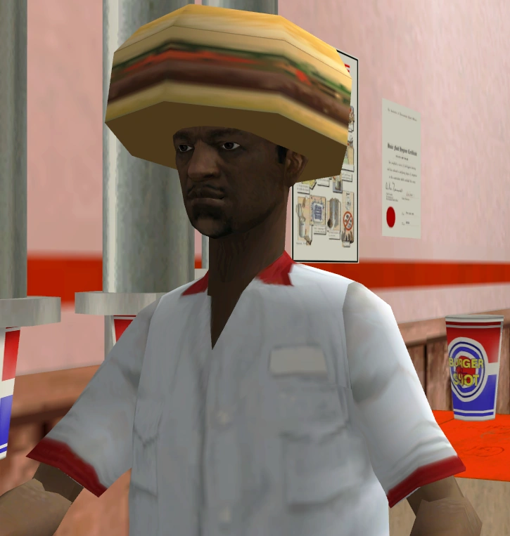 Compañero de OG Loc | El compañero de OG Loc, como se le define el nombre, es compañero de OG Loc en el Burger Shot de Verona Beach donde trabajaba anteriormente antes de saltar a la fama. El compañero de OG Loc aparece únicamente en la misión Management Issues, al principio de la cinemática, al atender a CJ que preguntaba por Loc para hablar con él y, con el máximo desprecio, le dice que está limpiando la freidora en la cocina. Posiblemente su relación es que seguramente sea el superior de Loc en el Burger Shot y que no se lleva nada mal con este. |