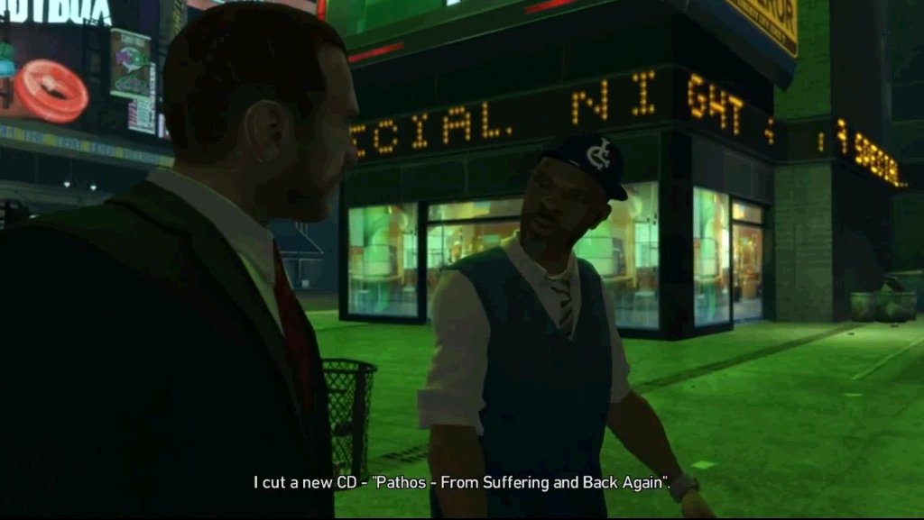 Niko ve Pathos otra vez en Cruce Estrella. Allí le pregunta como ha ido su vida, pero Pathos no llega a responder, ya que vuelve a defenderse de tipos que se burlan de él. Se acerca a ellos para agredirlos, pero estas personas sacan una pistola, y le dan un balazo en el estomago. Niko los mata uno por uno, y luego se monta en un coche, junto con Pathos. De camino al hospital, Pathos habla de si llegará vivo al destino, pero Niko lo calma. En el hospital, Pathos le dice a Niko, que otra vez le salvo la vida, y que aparte de que sus canciones irían inspiradas en él, le daría todo el crédito.