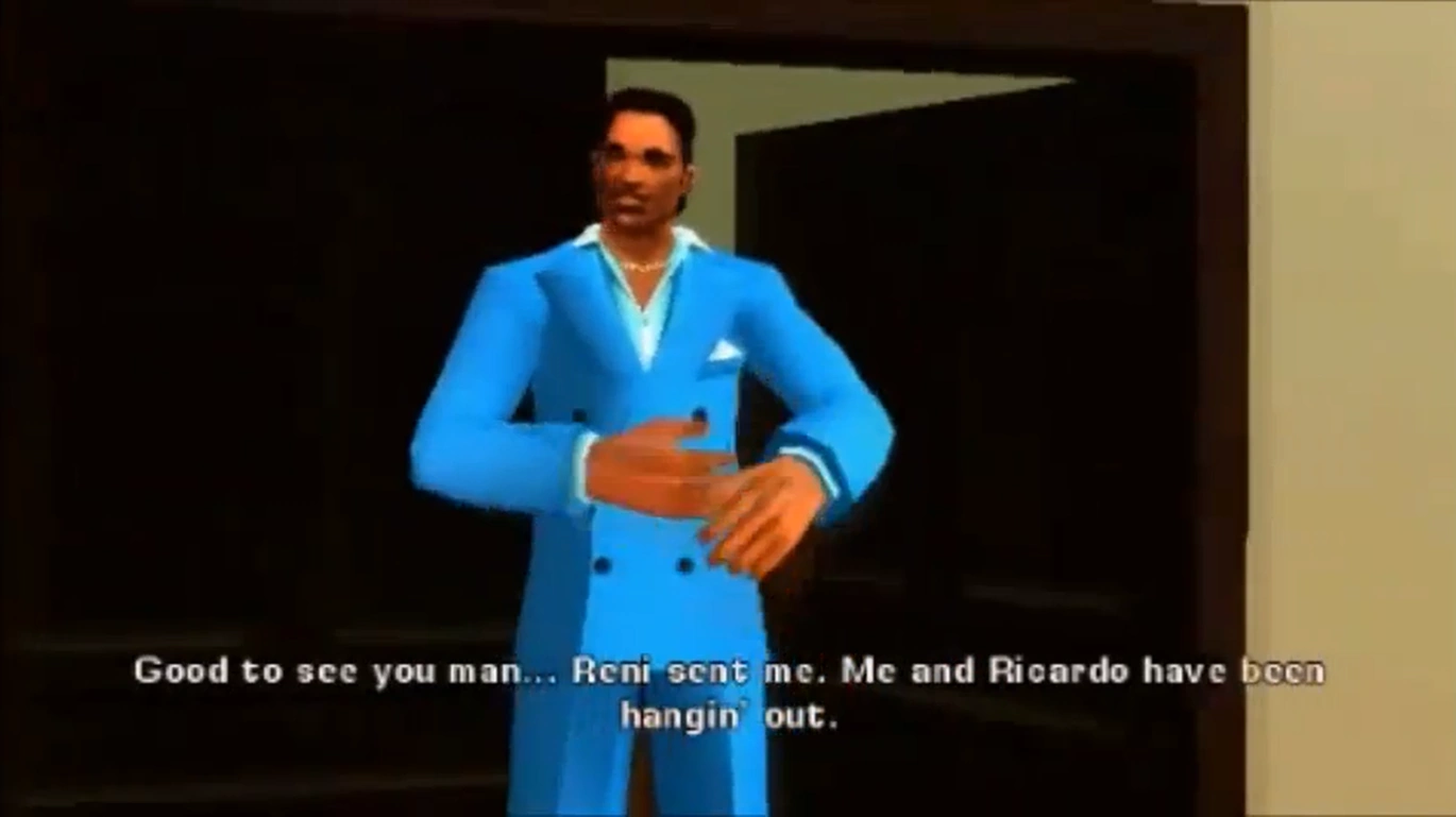 Ricardo Díaz se encuentra lavando dinero y a la vez, fumando un puro. Ricardo ve llegar a Vic y pregunta si él, a lo que éste confirma. Vic le pregunta lo mismo a Ricardo pero él responde sarcásticamente diciendo que no, que es Santa Claus. Ricardo le dice que ha oído hablar de él, que es amigo de los Hermanos Méndez pero Vic rectifica diciendo que no lo son exactamente. Luego de eso, llega Lance Vance y Ricardo le avisa que no le había dicho que su hermano era tan aburrido. Vic se sorprende de su llegada y Lance le habla que Reni también le ha enviado.