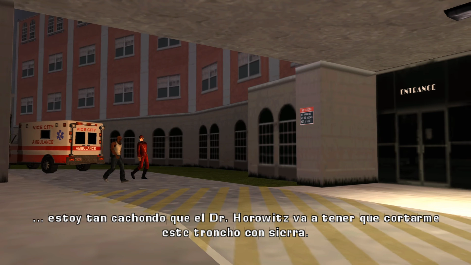 Poco después, un Sentinel XS abordado por matones de Méndez se acerca, por lo que Vic le pide a Reni que baje la cabeza pero éste toma su subfusil y comienza a disparar al coche enemigo, logrando que explote. Al ver esto, Vic le dice que siga disparando. Al llegar, Reni se encuentra emocionado por todos esos disparos y le dice que el doctor Horowitz va a necesitar una motosierra para cortar toda esa madera, a lo que Vic le responde que no le interesa saber lo que le vayan a hacer. Reni entra al hospital sin ningún problema, dejando a Vic afuera.