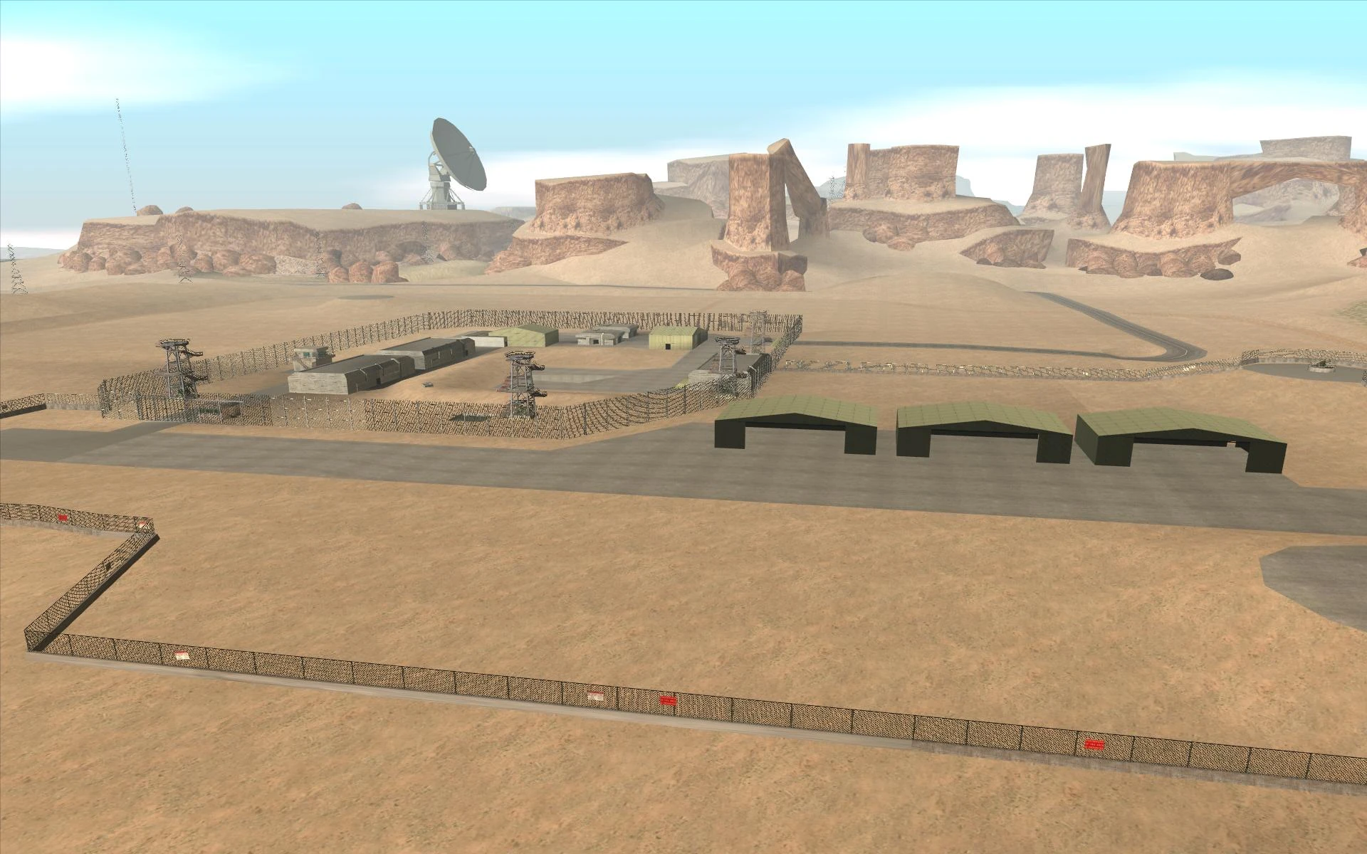 Do właściwej części bazy dostęp daje tylko niewielkie wejście od strony zachodniej; brama główna do środka kompleksu nigdy się nie otwiera. Płot otaczający tę część jest zdecydowanie wyższy od tego, który otacza część lotniskową. Na terenie obiektu znajduje się siedem wież kontrolnych, ulokowanych na jego obrzeżach; w misji Czarny projekt znajdują się na nich reflektory, oświetlające placówkę, jednak nie ma ich tam w trakcie rozgrywki swobodnej.