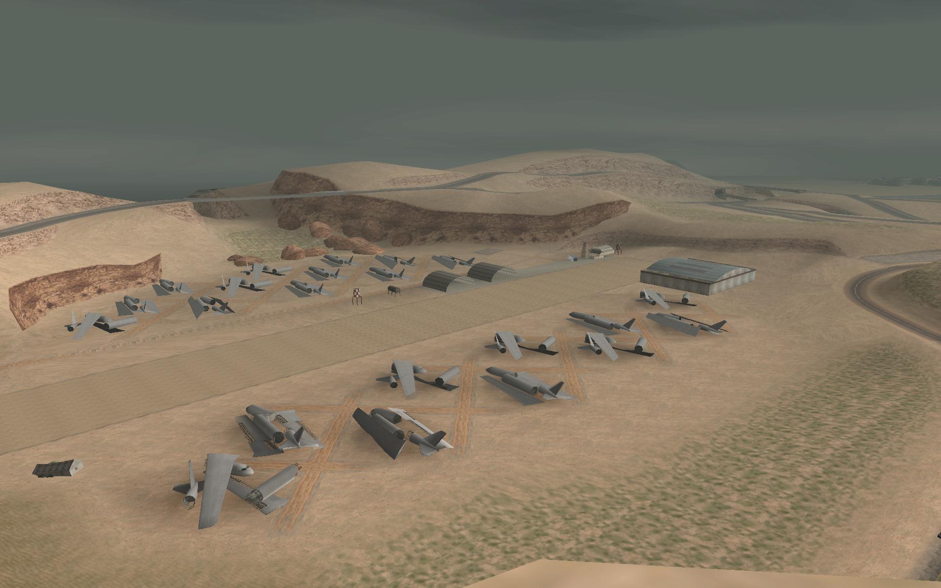 Lotnisko posiada dość długi nieutwardzony pas startowy o długości 524 m, wokół którego rozsiane są dwadzieścia dwa wraki samolotów oraz jedna chatka, która najprawdopodobniej została zasypana przez burzę piaskową. We wschodniej części lotniska znajdziemy dwa małe hangary wojskowe. Obok nich jest lądowisko dla helikopterów, przy którym znajdziemy Lewiatana. Następnym punktem jest mała przyczepa kempingowa i czerwono-biała wieża strażnicza. Następnie zobaczymy budynek Szkoły pilotażu oraz naszą kryjówkę (Szkoła pilotażu jest na pierwszym piętrze). Za budynkiem stoi zniszczona składownia paliwa lotniczego. Po drugiej stronie pasa znajduje się hangar, w którym zmieszczą się maksymalnie cztery samoloty (obok niego jest też wiatromierz). Na terenie całego lotniska znajdziemy też osobne zbiorniki paliwa i czerwono- białe wieżyczki zakończone walcem. W niektórych miejscach rośnie pustynna roślinność.