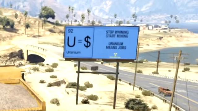 Как и любая денежная единица, GTA$ также имеет свой «курс». На Джошуа-роуд у железнодорожного переезда можно найти рекламный билборд, который гласит, что один атом урана стоит один доллар. Так, возможно, обыгрываются завышенные цены на продукты в мире GTA в сравнении с реальным миром, либо же намекается, что в Сан-Андреасе радиоактивные продукты находятся в лёгком доступе.