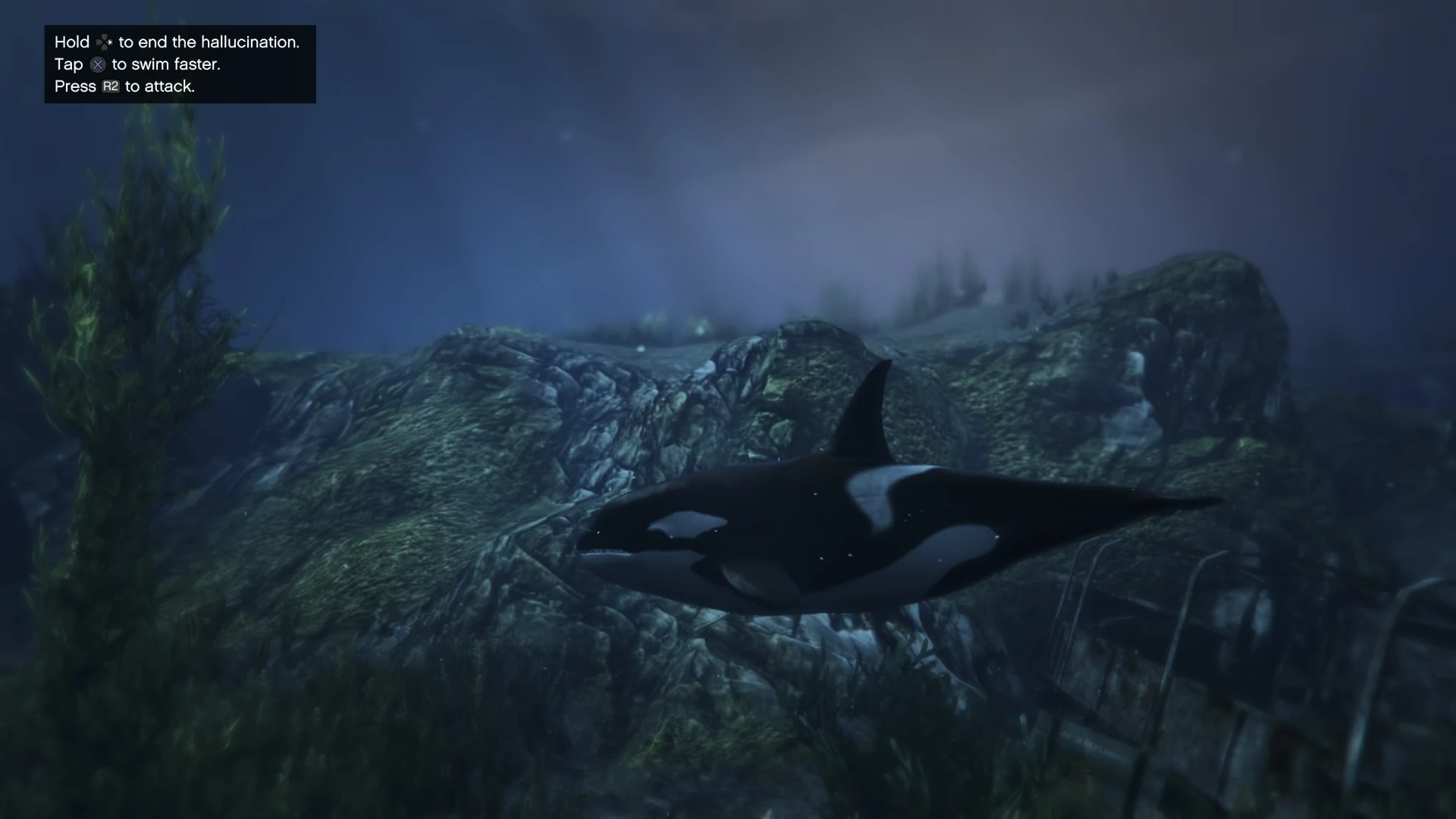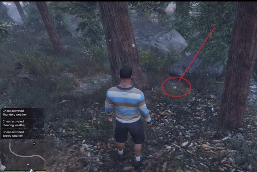 - Можно найти пасхальное яйцо. По всему подножью горы Чилиад спрятаны остальные шесть лофофор с бигфутом, которые активируются по одной на каждый день недели также с 5:30 до 8:00. После того, как стали Бигфутом, недалеко от вас будут появляться трупы животных и людей (а также подорванная машина). У последней 7 лофофоры у Грейпсида будет находиться труп охотника из миссии «The Last One». Далее можно слышать рёвы и идя каждый раз на этот звук, можно найти на каждый по 9 трупов, спрятанных на разных местах и наконец, если зайти на свалку самолётов, расположенную недалеко от тюрьмы и спрятаться в определённое место, то погода будет переделана на грозу и из под одного из самолётов выскочит зверь из разных дел GTA Online, с которым нам предстоит сразится (рекомендуется включить чит-код на бессмертие на 5 минут, а иначе если он нас убьёт (у него всё те-же спецспособности, что и в GTA Online), то мы очнёмся и придётся находить лофофору и делать всё это заново). Зверь будет призывать ротвейлеров и если мы его убьём, то мы очнёмся и в режиме режиссёра, если выбрать бигфута и нажать на L3 и R3 одновременно (на PS4) или левый Shift+CTRL (на ПК), то мы активируем зверя и сможем играть за него, используя способности из GTA Online.