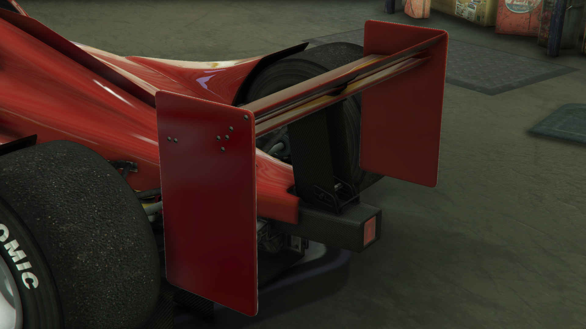 Задняя часть оснащена одним квадратным задним фонарем и диффузором с четырьмя лопастями, а также двумя направленными вверх выхлопными трубами возле задней оси и соответствующими рычагами управления и тормозными каналами. Заднее крыло смонтировано на двух опорных рамах и состоит из большой поверхности в нижней части вместе с двумя склепанными рёбрами, нижние половины которых повернуты под углом к автомобилю. Вся нижняя часть автомобиля покрыта карбоном и разделена на узкие панели для носовой части/салона и более широкую панель для основного корпуса и диффузора.