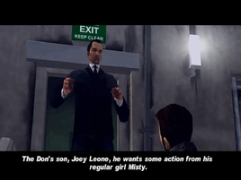 Луиджи Готерелли: Эй, иди сюда, поговорим… Мик, я с тобой попозже поговорю. Как жизнь, парень? Джоуи Леоне, сын дона, хочет поразвлечься с моей девчонкой Мисти. Сгоняй за ней в Хепбёрн-Хайтс… но учти, этот район контролируют Дьяволы. Отвези её к нему в гараж в Трентоне, и поживее, Джоуи не из тех, кто привык ждать, так что одна нога здесь… да, и советую смотреть на дорогу, а не на Мисти! Мисти: Ты работаешь на Луиджи, да? Похоже, он наконец нашёл водилу, которому можно доверять! Мисти: Джоуи… Твоя большая штука опять по мне соскучилась? Джоуи Леоне: Иди, я сейчас, заводная моя. Хай, я Джоуи. Луиджи сказал, что ты свой парень, так что заходи как-нибудь, может, и у меня будет для тебя работёнка. Хорошо? | ||