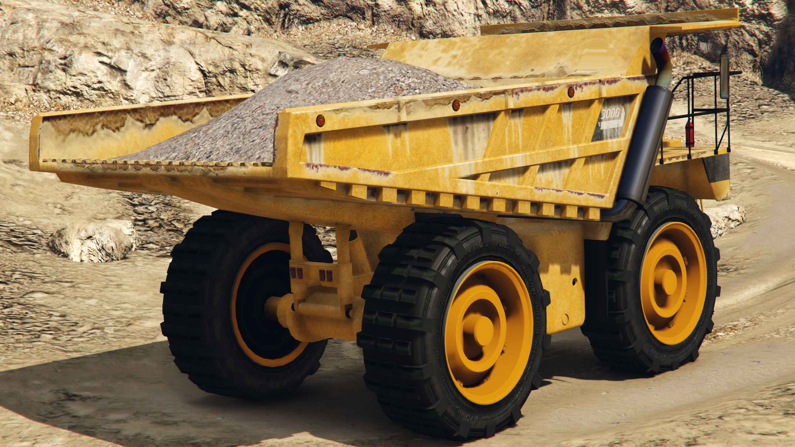 Шасси автомобиля имеет большие крылья/протекторы за передними колёсами и большие топливные баки между колёсами, а верхнюю часть занимает длинная выхлопная труба. Кузов самосвала, который имеет различные маркерные огни по верхним краям всегда загружен грязью/гравием (хотя, в отличие от самосвала в GTA San Andreas, им нельзя управлять). В задней части расположены различные шарнирные рычаги для самосвала и небольшая панель, на которой размещены внешние фары и внутренние стоп-сигналы.