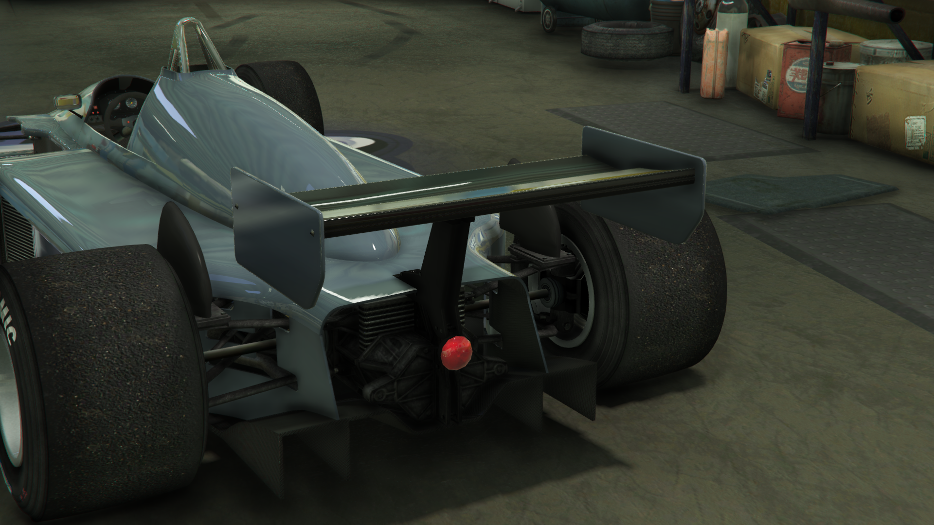 Задняя часть оснащена одним круглым задним фонарём, диффузором с четырьмя лопастями и двумя выхлопными трубами, а также соответствующими рычагами управления и тормозными каналами. Заднее крыло установлено на двух опорных рамах и состоит из плоской поверхности в нижней части и наклонной задней поверхности в задней части, а также двух коротких клёпаных рёбер жёсткости преимущественно прямоугольной формы. Вся нижняя часть автомобиля покрыта карбоном и разделена на узкие панели для носовой части/кабины и более широкую панель для основного корпуса и диффузора.