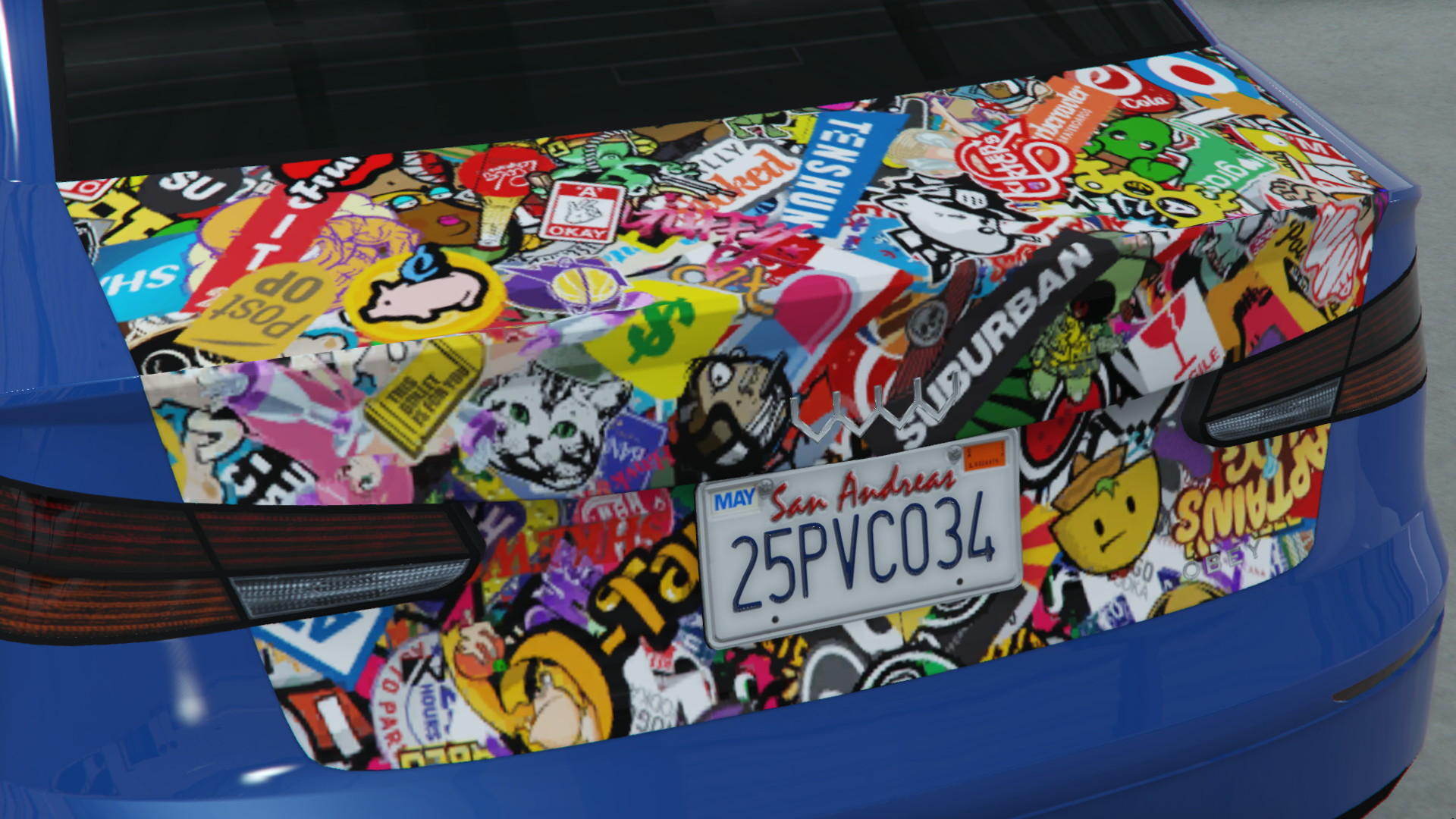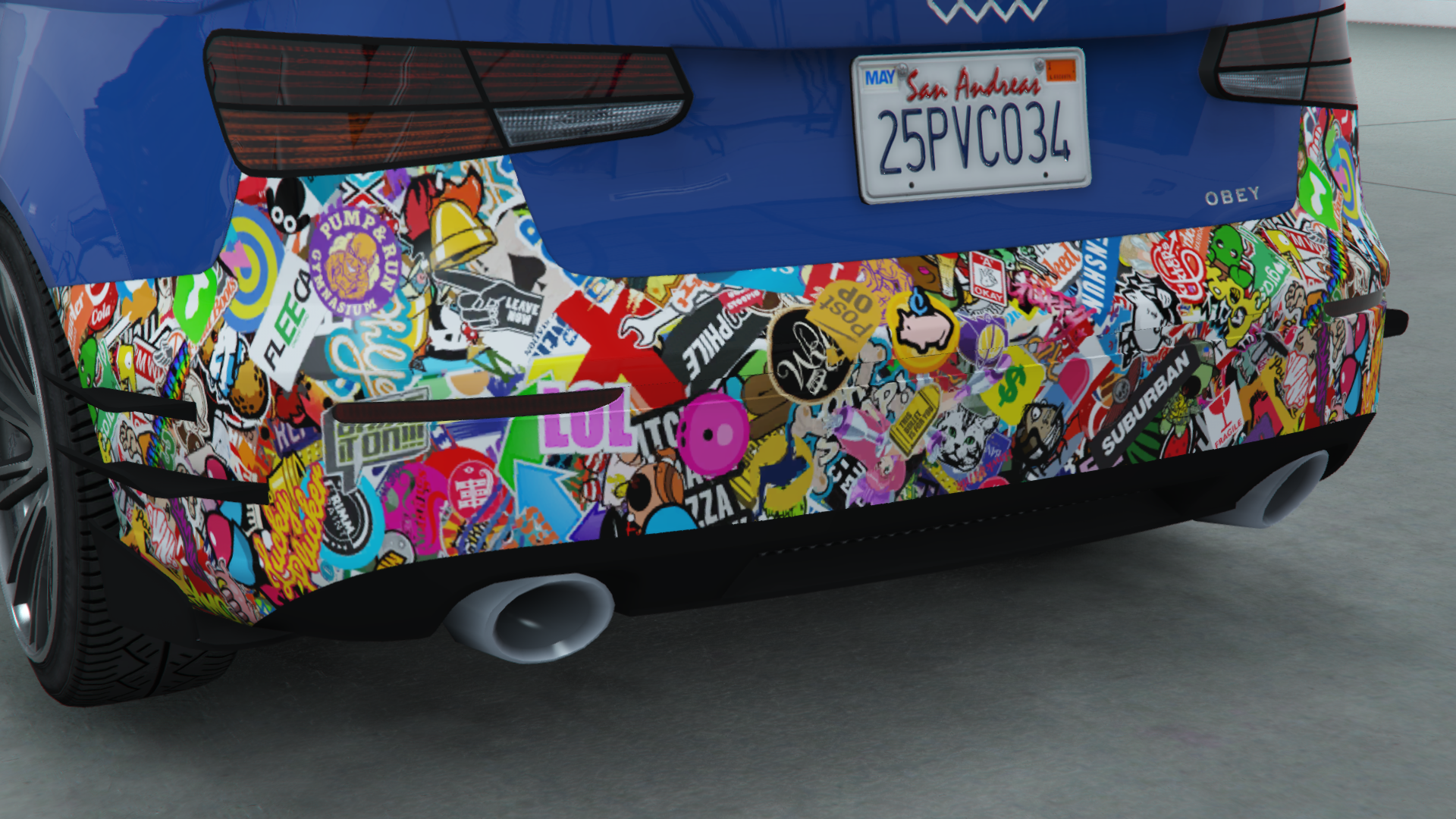 Задняя часть автомобиля имеет небольшой спойлер на конце багажника, в то время как на задней части находится эмблема производителя ниже, значок Obey в нижнем правом углу крышки багажника и номерной знак по центру. У автомобиля большие задние фонари, разделённые на четыре блока, внешние из которых состоят из верхних красных основных фонарей и нижних янтарных указателей поворота, в то время как внутренние расположены внутри крышки багажника и состоят из верхних красных стоп-сигналов и нижних белых фонарей заднего хода. Задний бампер относительно простой и имеет два красных блока/отражателя со слегка вставленной деталью между ними, а также чёрную часть с молдингами для круглых выхлопных труб.
