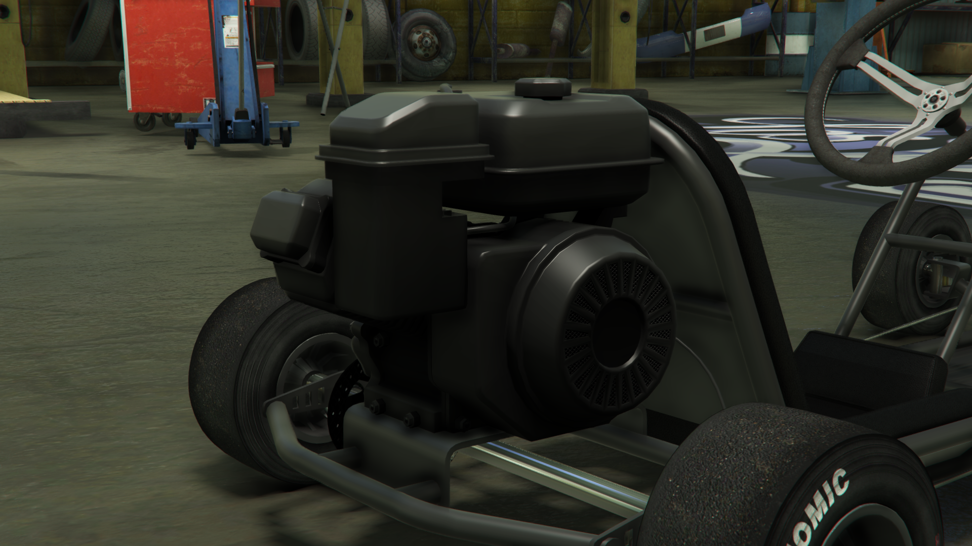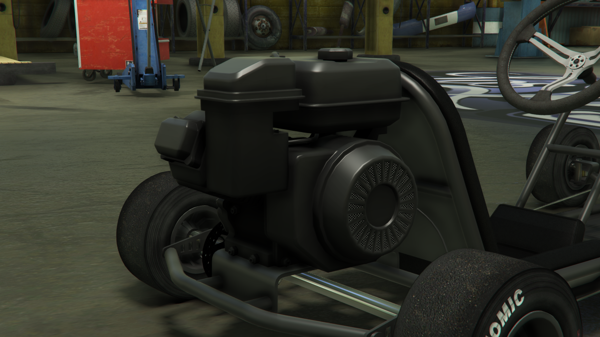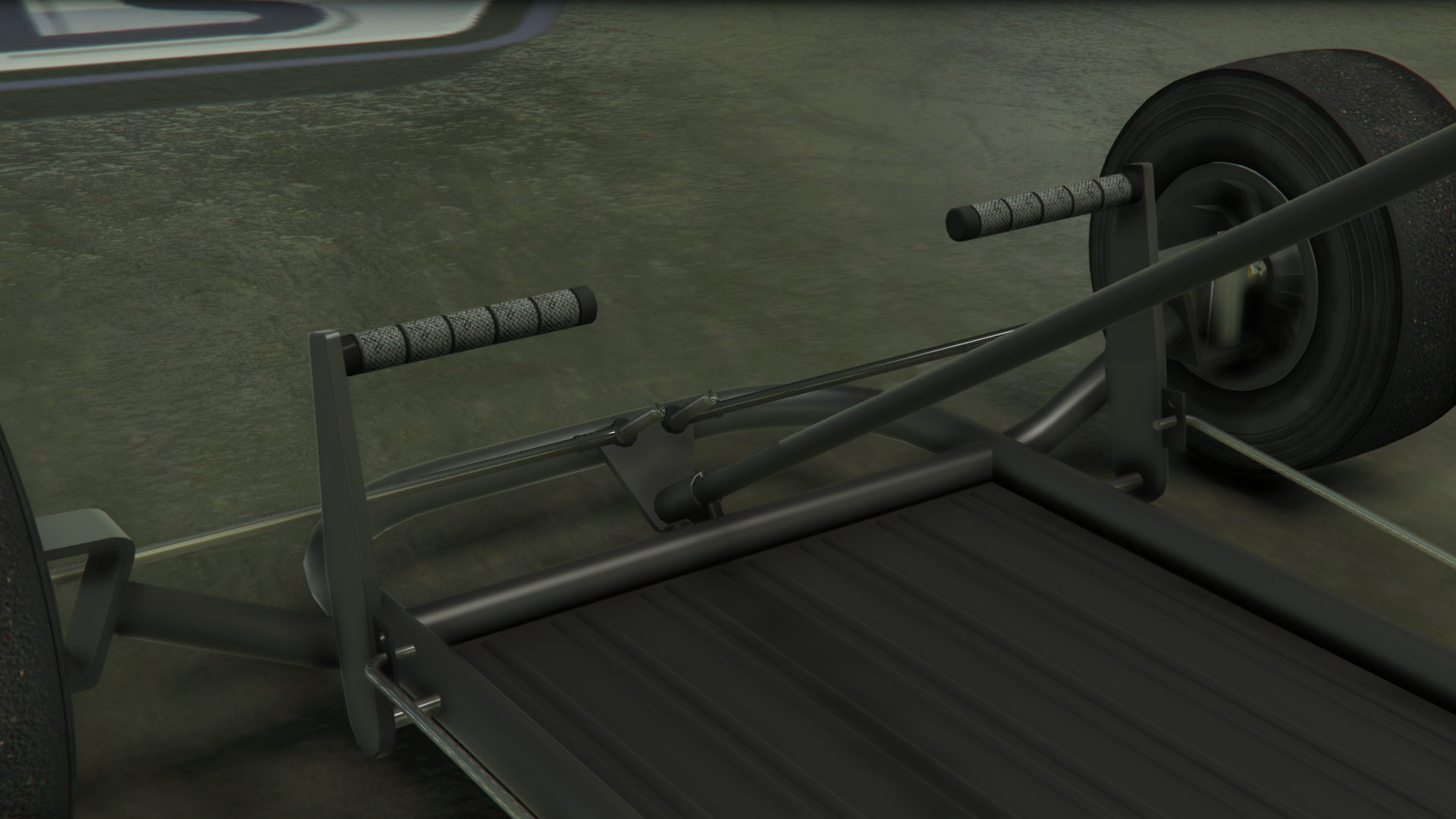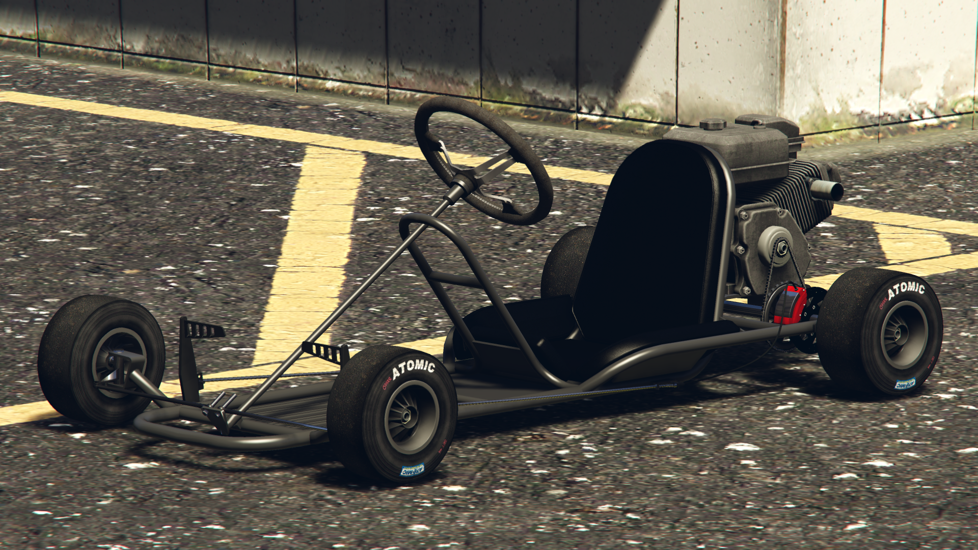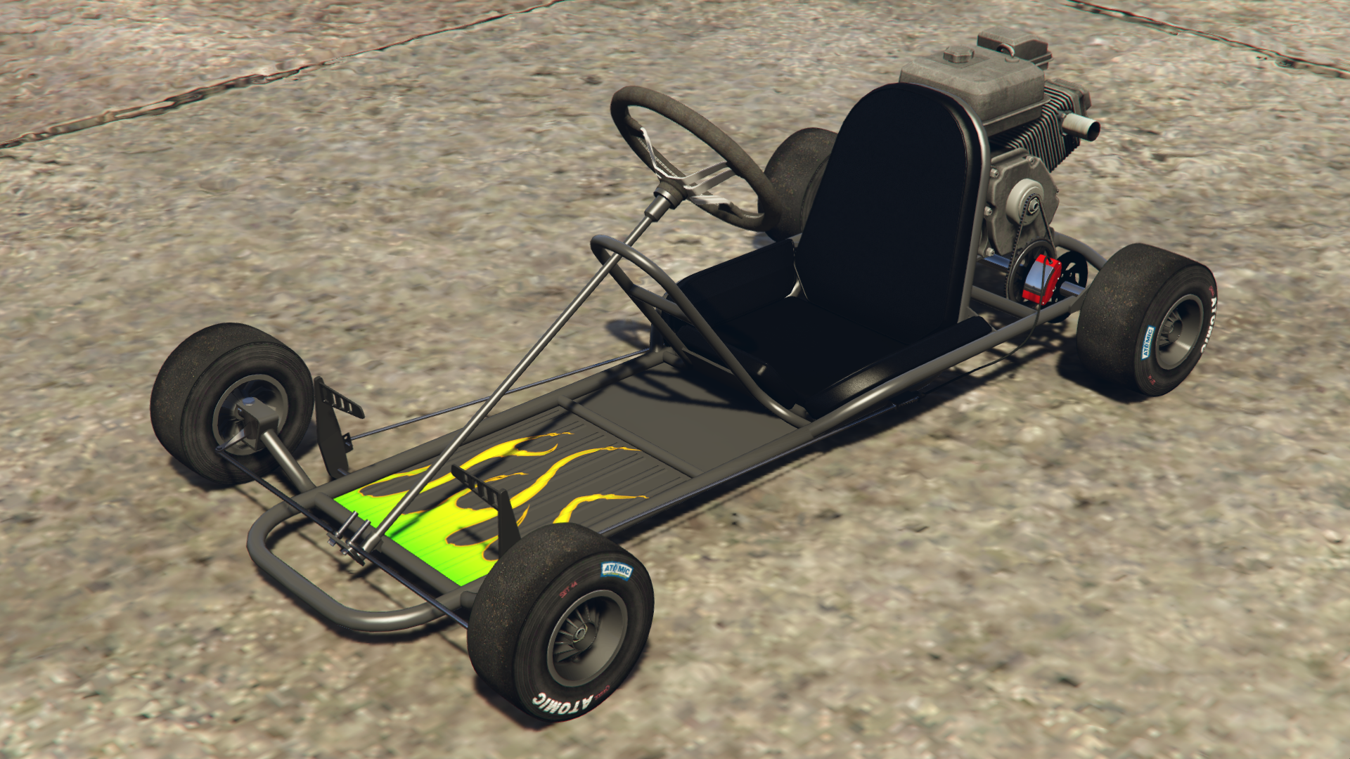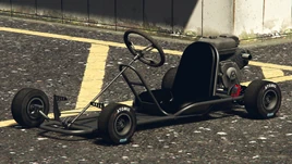 Транспортное средство изображено с простым трубчатым стальным каркасом шасси и базовым полом, где в передней части находятся передние колёса, рулевой механизм и две боковые педали, обеспечивающие соответствующие элементы управления дроссельной заслонкой и тормозами, в то время как в задней части находится основное сиденье, небольшой двигатель с небольшим выхлопом и топливным баком, а также задняя ось с одним тормозным диском и цепным приводом с левой стороны, соединённым с двигателем. Поскольку транспортное средство не предназначено для использования на основных дорогах, в нём отсутствуют какие-либо формы освещения или циферблатов, хотя радио всё ещё доступно.