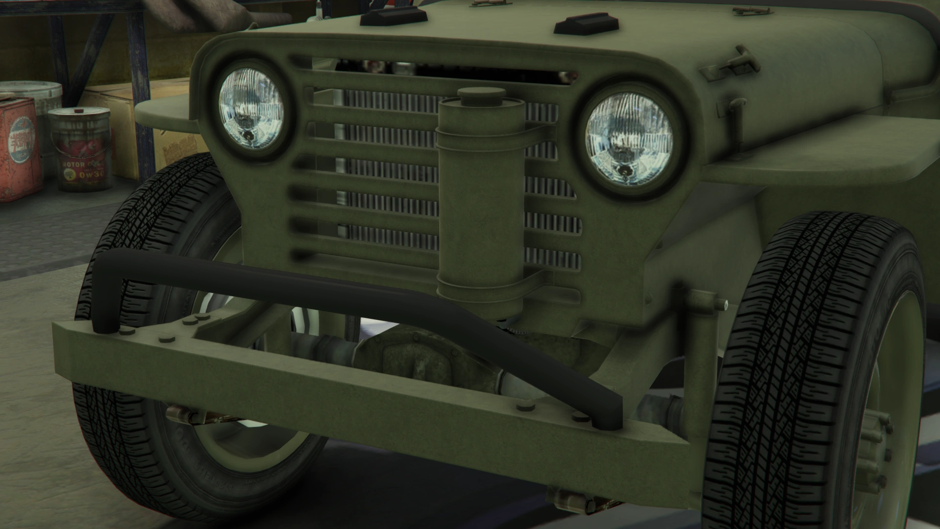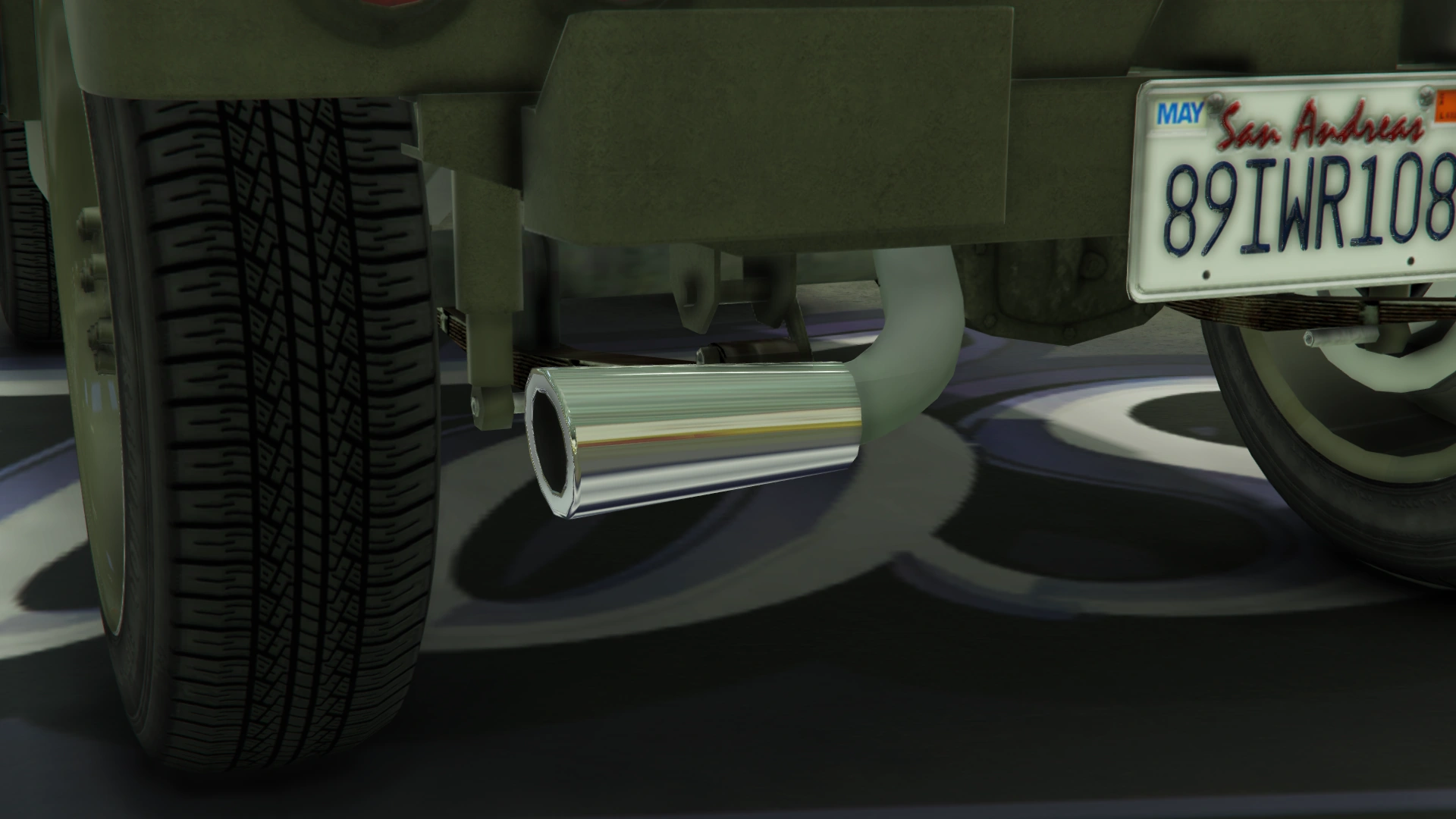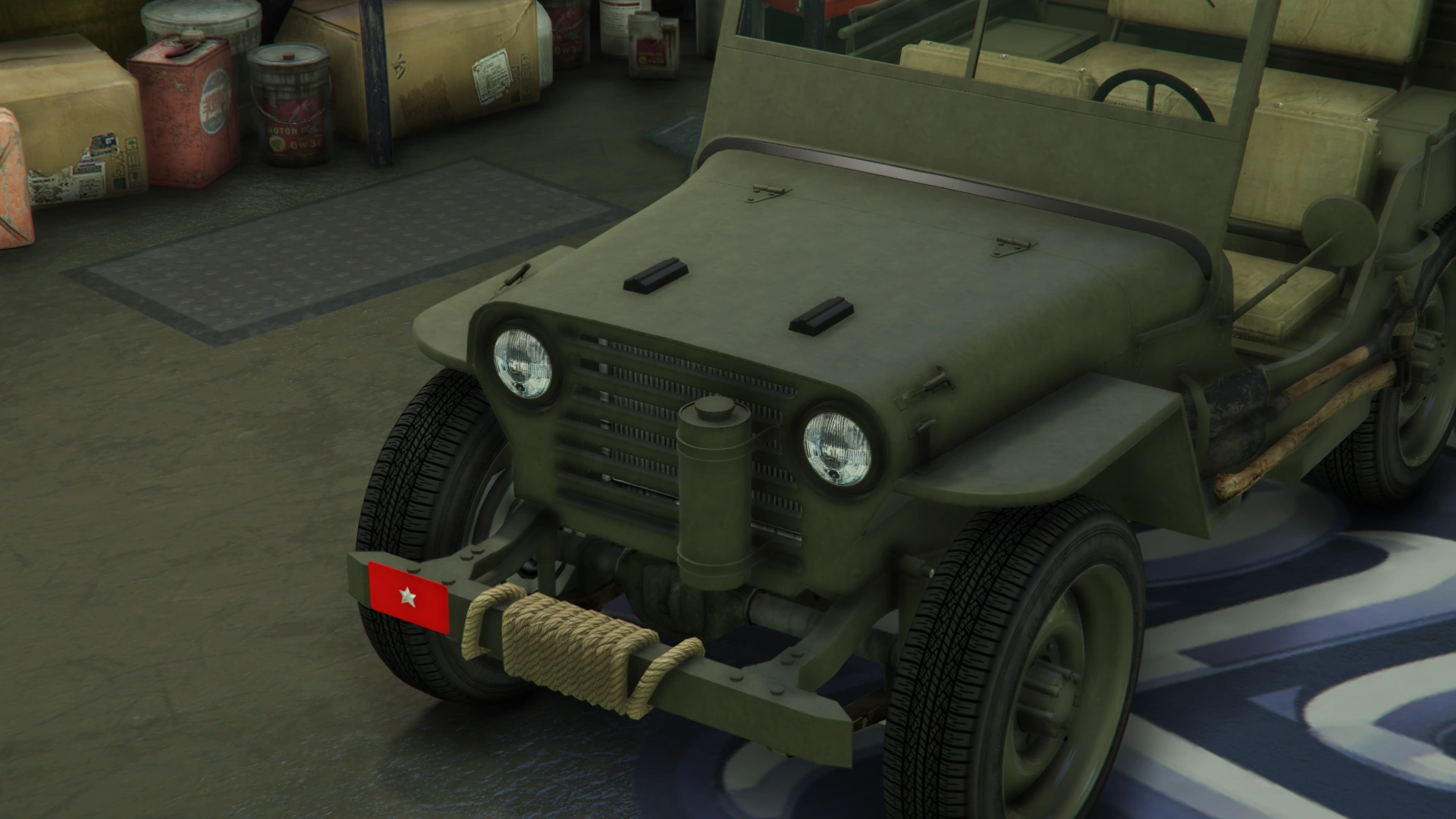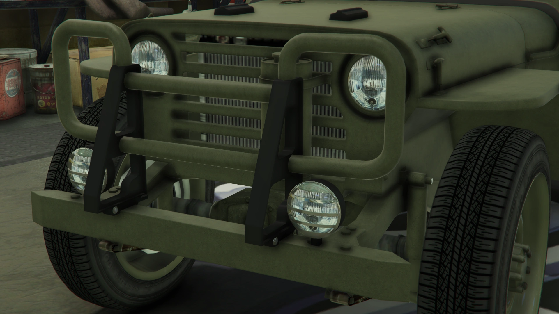В задней части преобладают запасное колесо с правой стороны кузова и канистра с топливом с левой стороны, прикреплённая к кузову жёлтым ремнём. Есть набор внешних круглых фонарей и внутренних разделённых фонарей, а также небольшой бампер с номерным знаком.
