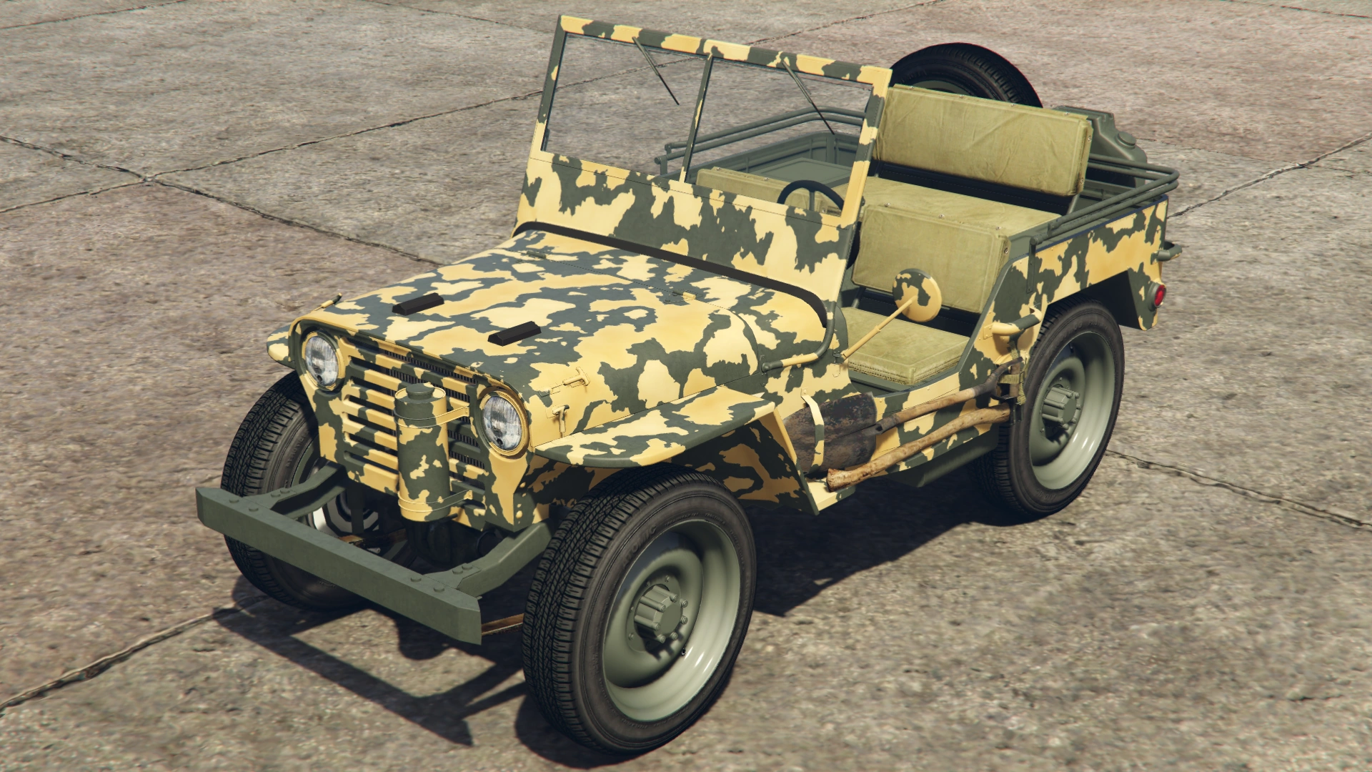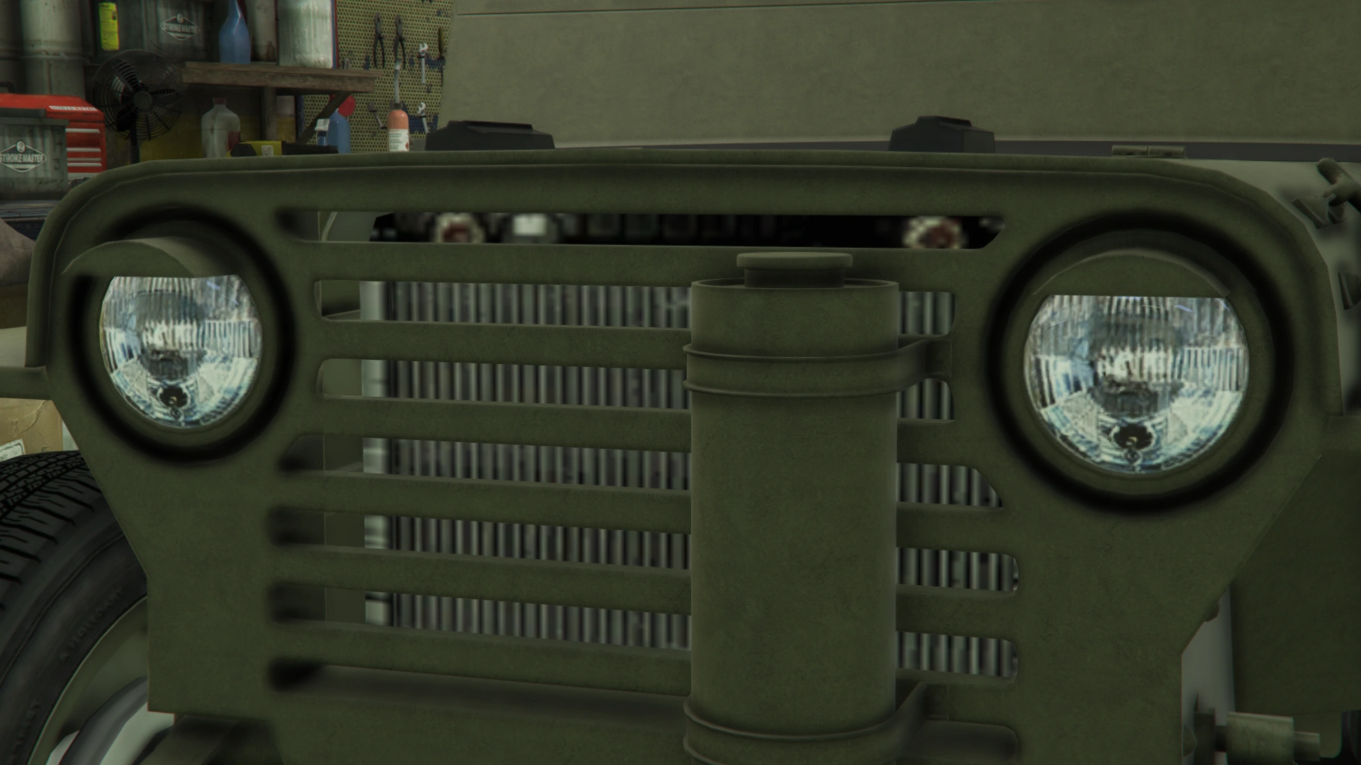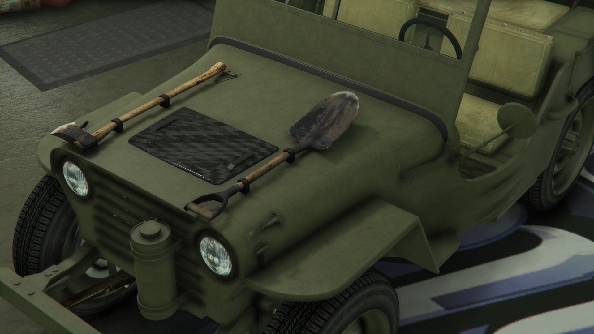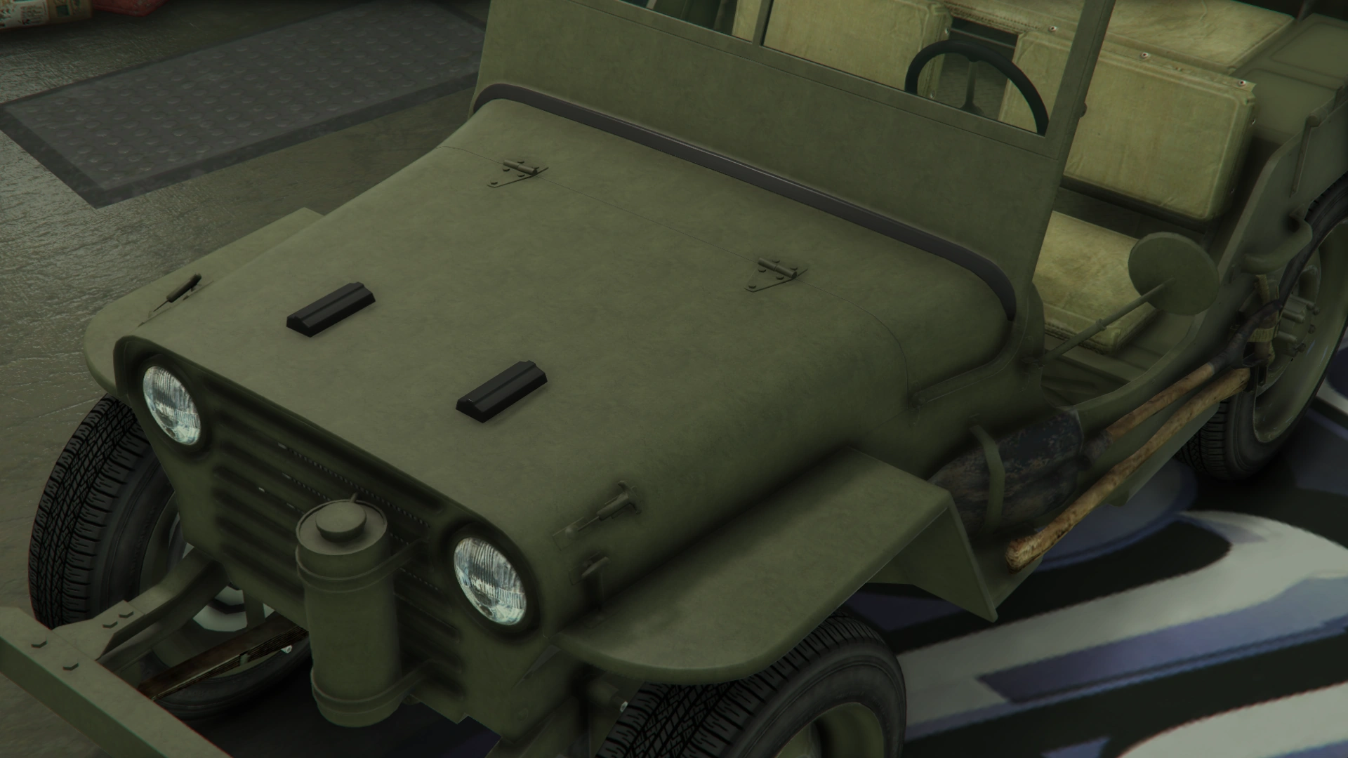 Боковые части кузова имеют линейные формы для передних крыльев и ниш для задних колёс, а также подножки в задней части и тонкие рамки по верхним краям. Со стороны водителя есть одно круглое зеркало заднего вида, закреплённое на нижней рамке, и набор инструментов, которые обычно встречаются на внедорожных/военных транспортных средствах, а также габаритные огни на крайних частях. В салоне наклонная стена с разделённым ветровым стеклом. Хотя это ветровое стекло не является интерактивным никоим образом, оно имеет резиновую основу и тонкие рамки с шарниром по бокам, что теоретически позволяет пользователю складывать и опираться на резиновые детали капота, а также тонкие ручки на верхних сторонах и предохранительные крючки на отсеке кабины, чтобы сложить его обратно в исходное положение.