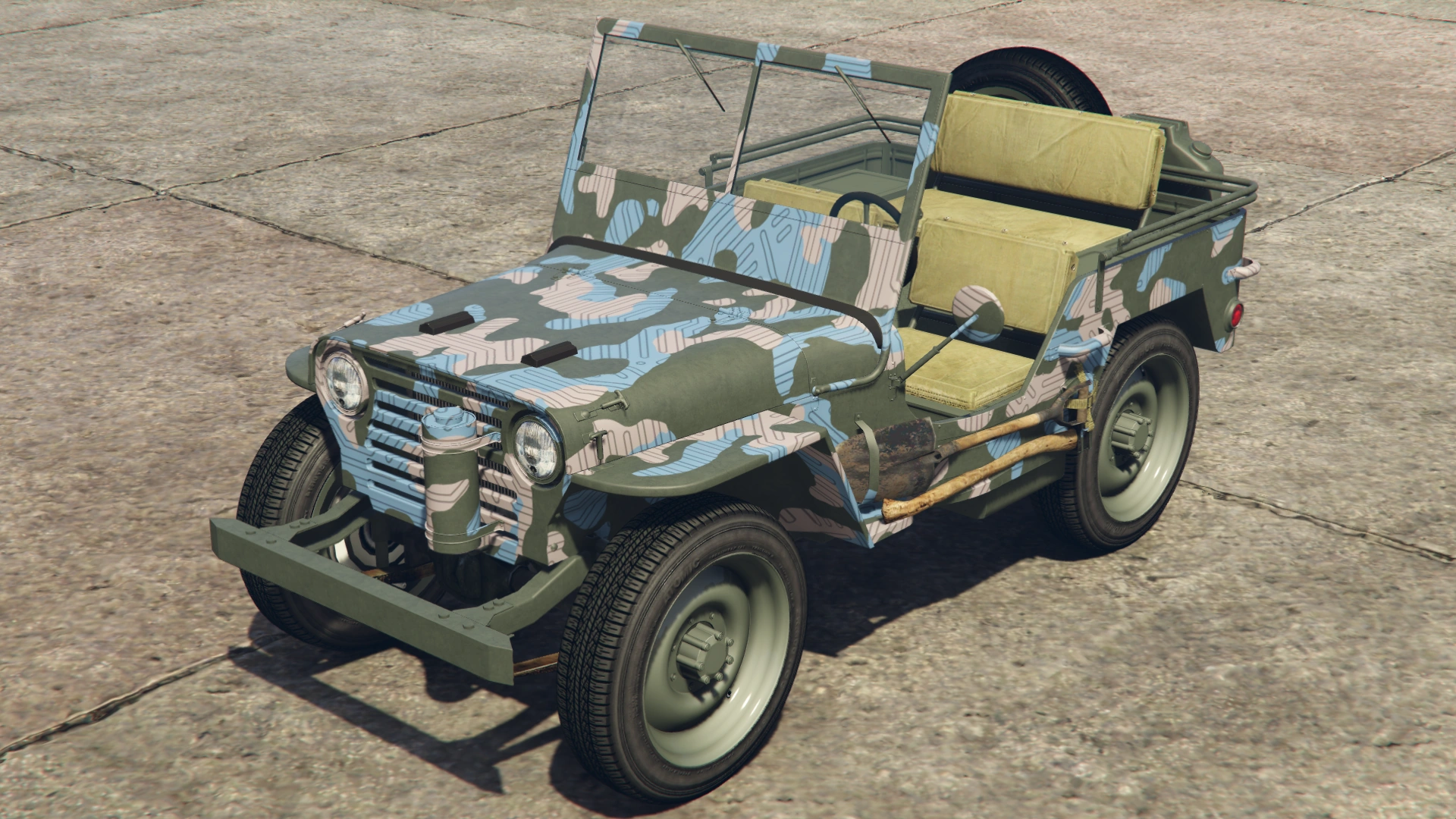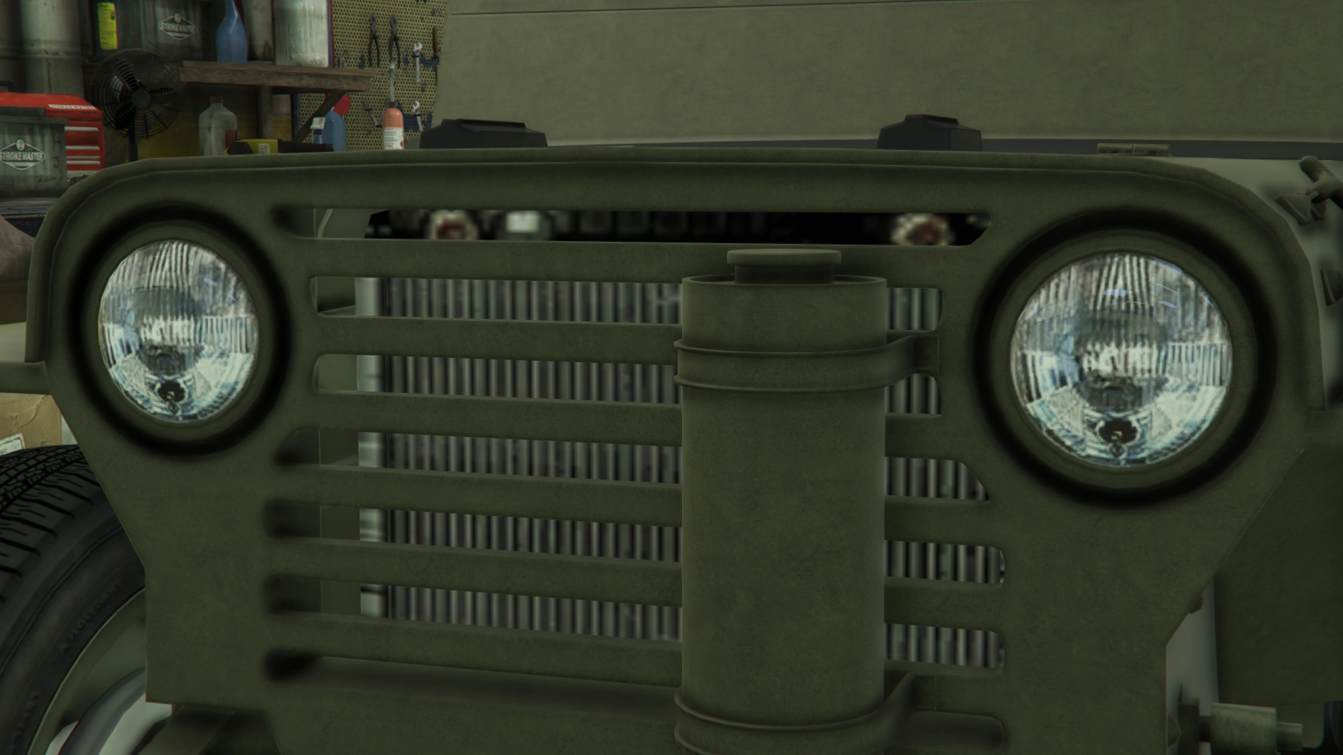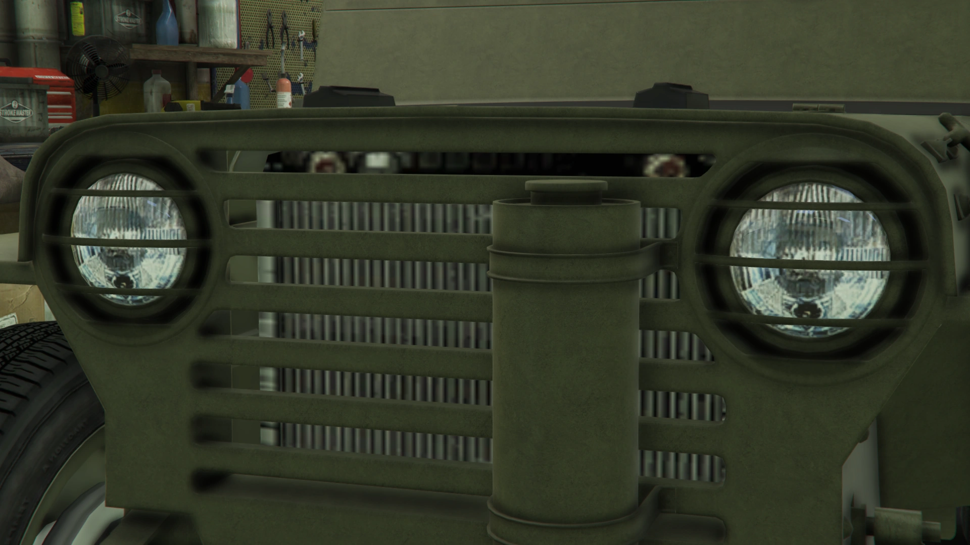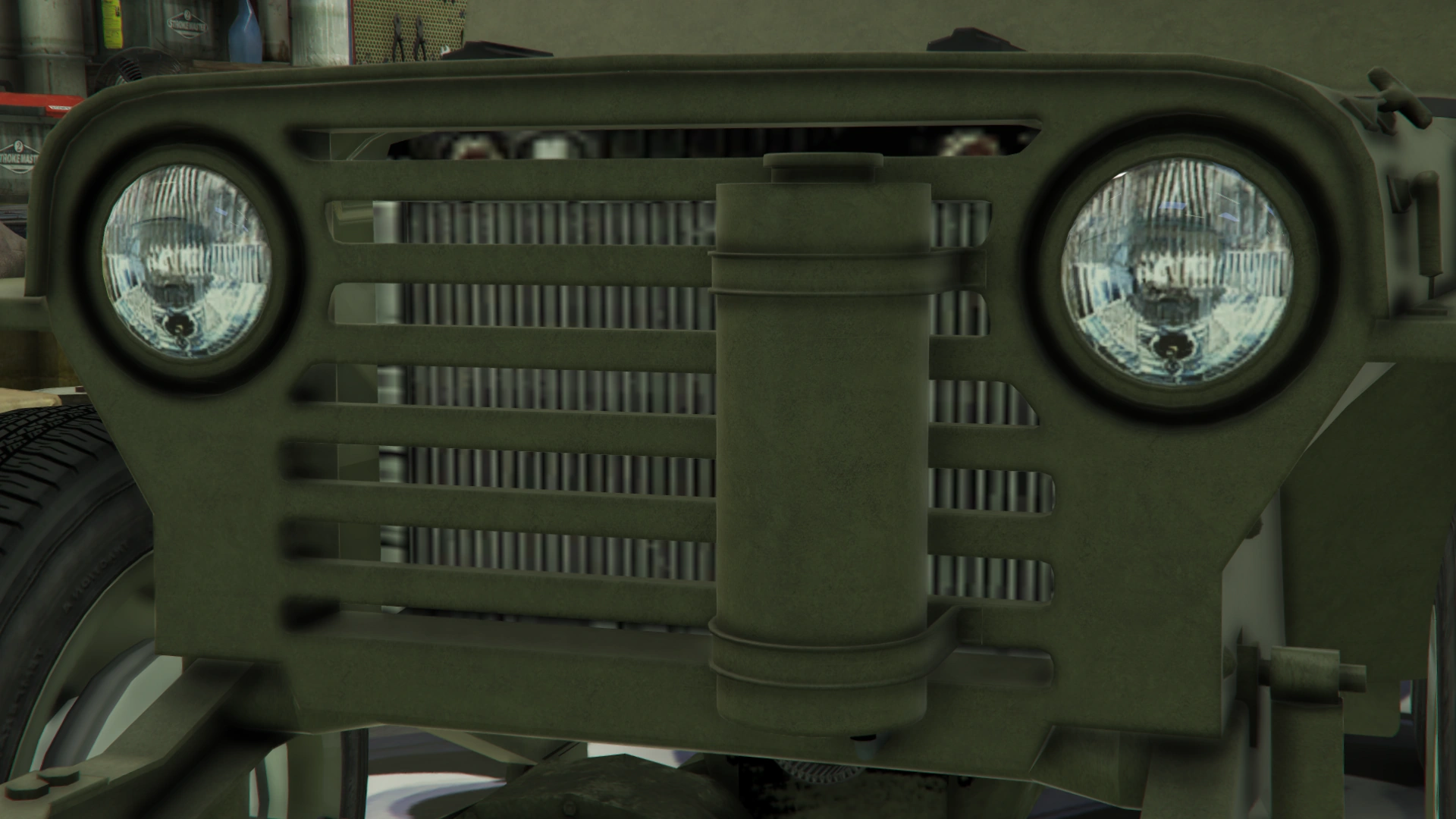 Боковые части кузова имеют линейные формы для передних крыльев и ниш для задних колёс, а также подножки в задней части и тонкие рамки по верхним краям. Со стороны водителя есть одно круглое зеркало заднего вида, закреплённое на нижней рамке, и набор инструментов, которые обычно встречаются на внедорожных/военных транспортных средствах, а также габаритные огни на крайних частях. В салоне наклонная стена с разделённым ветровым стеклом. Хотя это ветровое стекло не является интерактивным никоим образом, оно имеет резиновую основу и тонкие рамки с шарниром по бокам, что теоретически позволяет пользователю складывать и опираться на резиновые детали капота, а также тонкие ручки на верхних сторонах и предохранительные крючки на отсеке кабины, чтобы сложить его обратно в исходное положение.