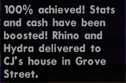 “100% achieved! Stats and cash have been boosted! Rhino and Hydra delivered to CJ's house in Grove Street.”