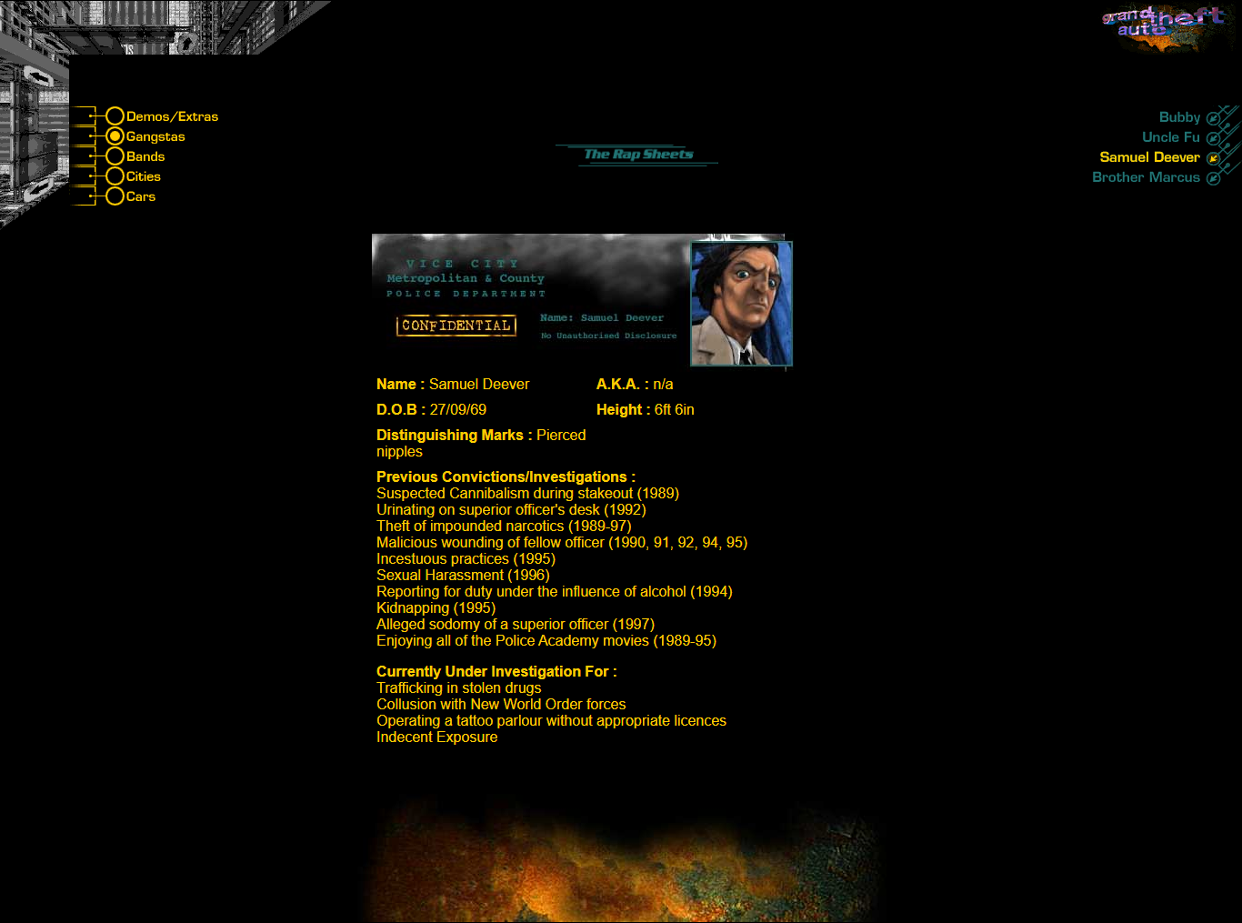 - Samuel Deever is still being investigated by the Vice City Police Department for a malicious wounding of a fellow police officer. [6]