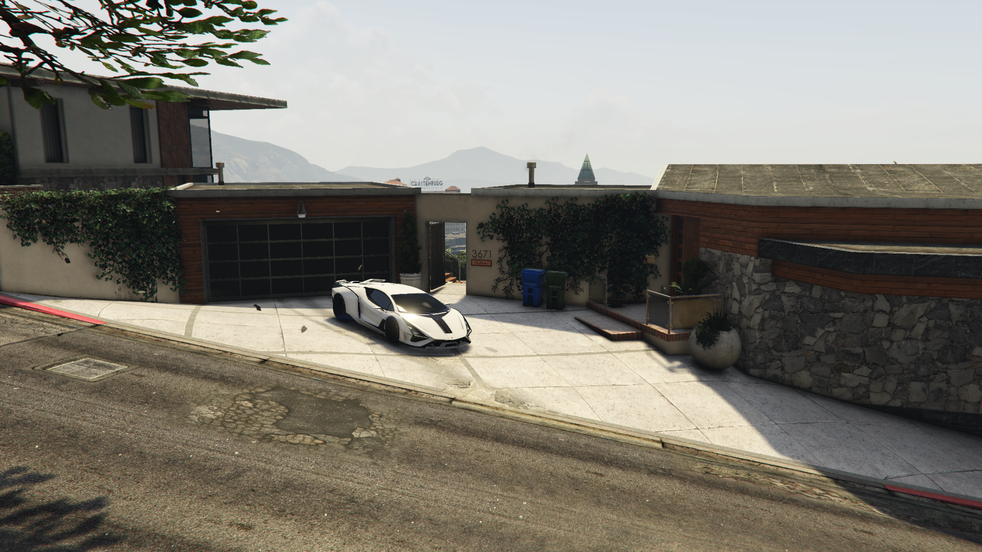 - The first home on the right as the player enters Lake Vinewood Estates in Marlowe Drive, is a replica of this house, with some minor differences (e.g. front entranceway missing, different arrangement of the solar panel array on the roof, additional airconditioning units on the roof, a different swimming pool, no visible interiors and no dog house in the back yard). This house appears for sale on Lennyavery-realty.com.
