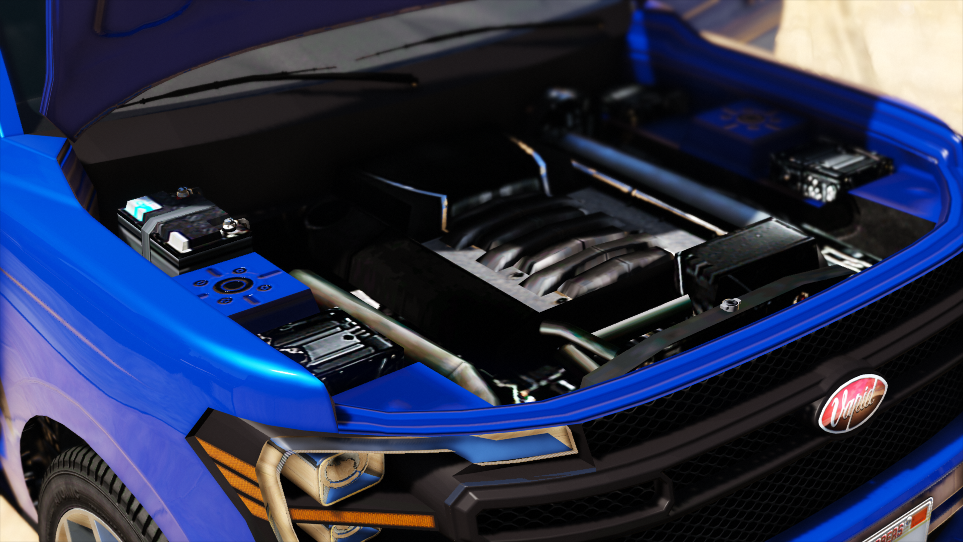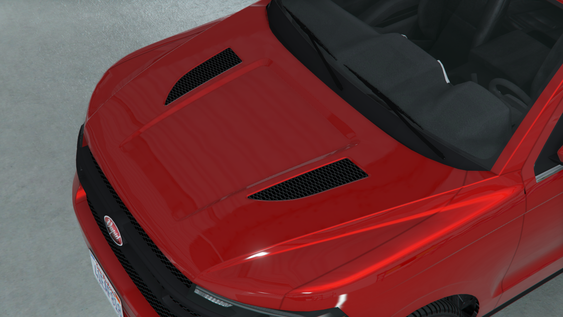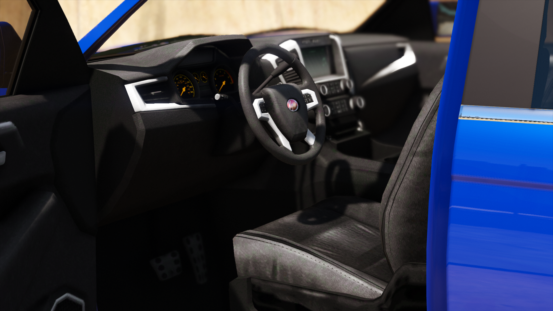 The interior of the car uses the same "Cavalcade" dial set and "New SUV White" arrangement as the Granger 3600LX, Issi Rally and the Vivanite. The Vapid logo can be seen on the horn cap.