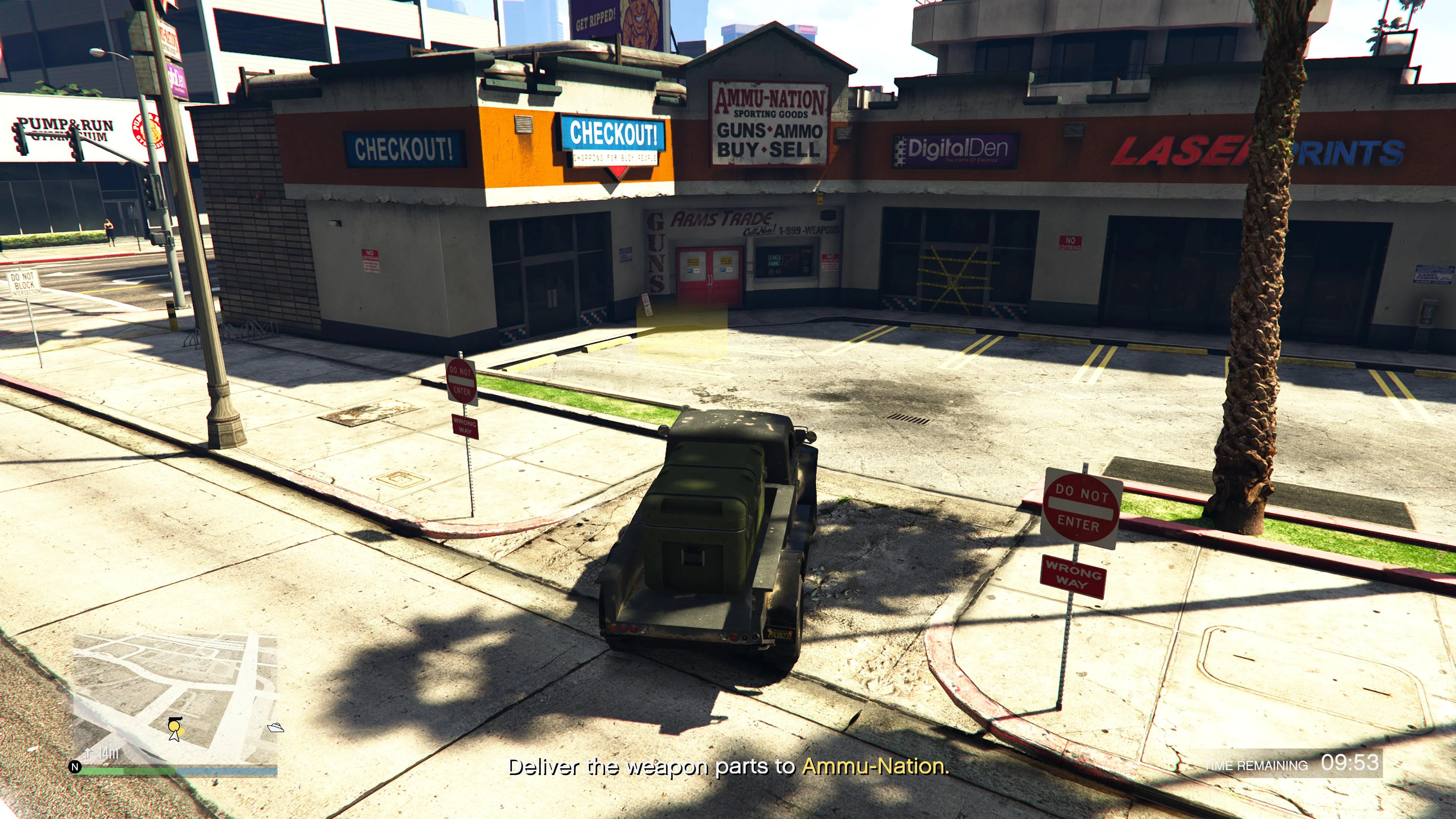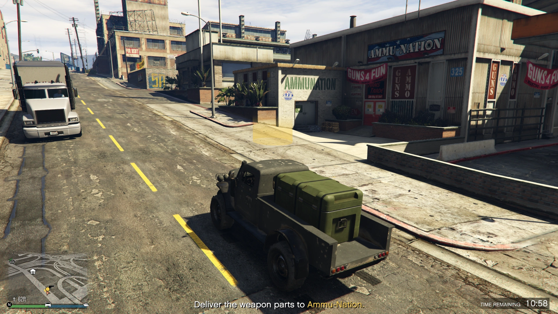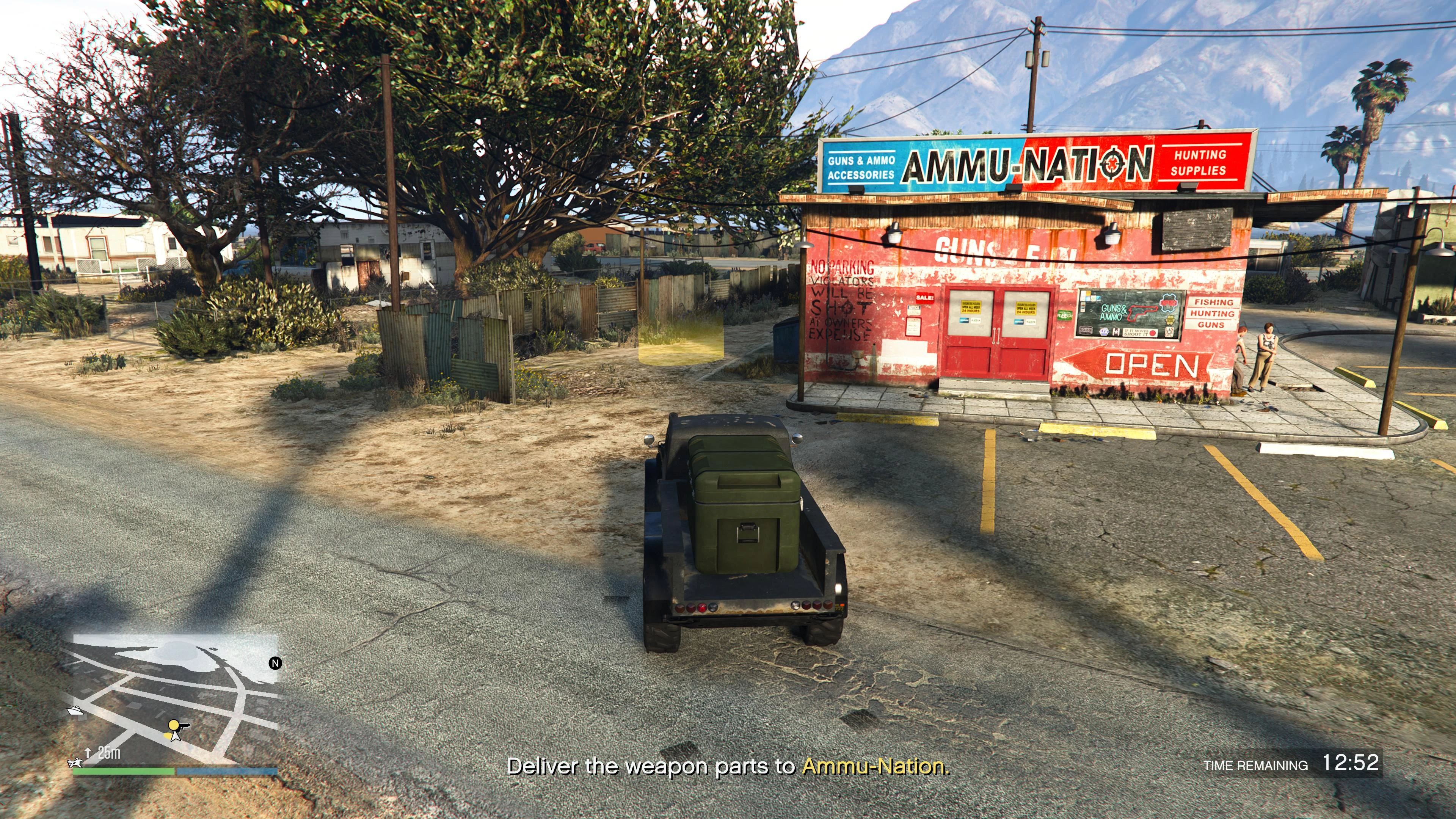 Upon entering the Duneloader, the player will be instantly exit the bunker and the mission will start. After a brief phone call from Agent 14, a destination will be given, which will be the loading dock or parking lot of any Ammu-Nation location in the state. The game will also accept airlifting the vehicle via Cargobob hook as a legitimate method of transport.