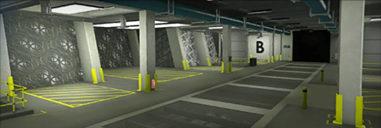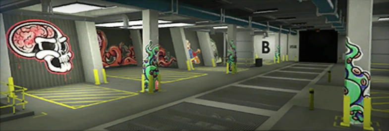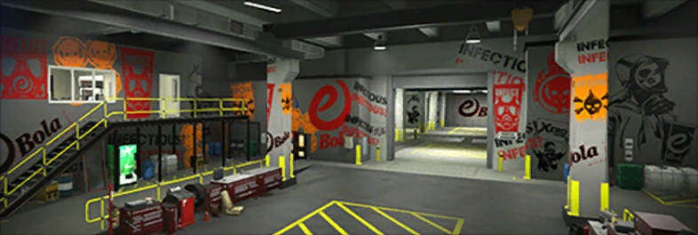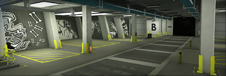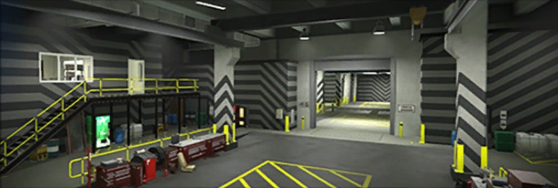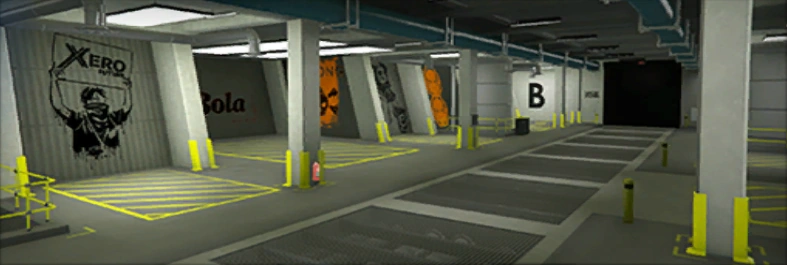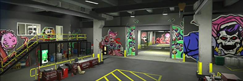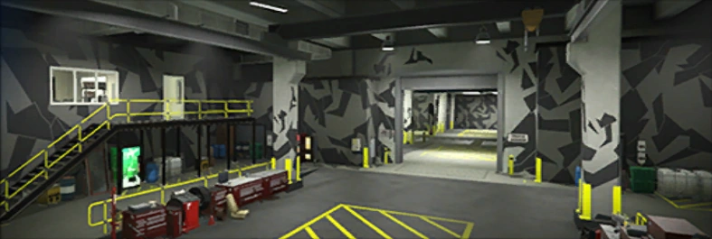 The workshop is connected to the 10-car garage, where players can store their Arena War vehicles, but nine spots can also be used to store other personal vehicles. Two more garage levels (if the player has purchased them) can be accessed via elevators.