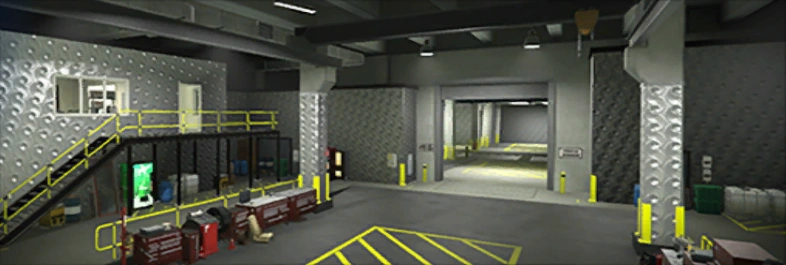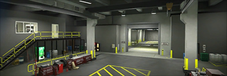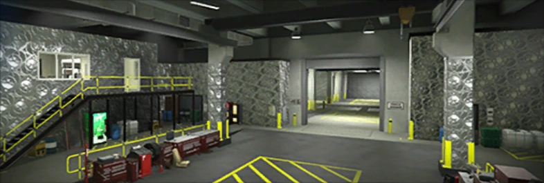 Going up the stairs, there are the offices, where the player can directly access the Arena War website on the laptop and check their progress in the Arena War Career. At the end is a trophy space, where a gun locker is located.