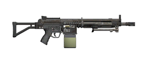 The Assault MG draws inspiration from the German Heckler and Koch HK 21 light machine gun. The stock however appears to be have been based on the Galil's folding stock.