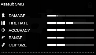 The Assault SMG is roughly similar to the Micro SMG and SMG in terms of range and accuracy. However, the Assault SMG deals a slightly more damage than these two, allowing to take out targets slightly faster. It appears to be slightly slower that the aforementioned SMGs in terms of fire rate, having only 460 rounds per minute.