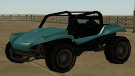 In Grand Theft Auto III, Grand Theft Auto: Vice City, Grand Theft Auto: Liberty City Stories and Grand Theft Auto: Vice City Stories, the BF Injection resembles a slightly enlarged Meyers Manx, a kit car made from a Volkswagen Beetle. It was designed by Bruce F. "BF" Meyers and was at one point manufactured by his company, B.F. Meyers & Co. (hence the BF part on the name). The vehicle retained the generally exaggerated design, with a rounded body, open cabin, exposed rear engine and large wheels. The GTA III rendition does not have headlamps (despite emitting light beams from its front fenders), but latter games rectified the issue with the addition of two circular headlamps, as well as additional hi-beam lamps mounted on the roll bars. While renditions in Liberty City have a small intake on the engine, the ones in Vice City can have either the same intake or small carburetors as extras. It can be seen with a wide array of primary body colours, with a secondary colour on the lower trims, generally painted in grey/silver.