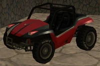 A unique black and red BF Injection appears in the mission Cut Throat Business in Grand Theft Auto: San Andreas. It is used to transport Carl Johnson and Madd Dogg to meet OG Loc. Because the player is unable to store this BF Injection in any garage during the mission (as it simply disappears after), it can only be acquired by killing Madd Dogg, thereby failing the mission, and taking the buggy to a safehouse garage. Its performance is no different to the standard BF Injection. | ||