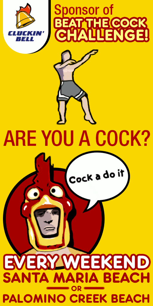 The triathlon is sponsored by Cluckin' Bell and poster ads for it can be seen in each gym in the game; a man dressed in the Cluckin' Bell clerk yellow cock-suit will take part of the event (hence, Beat The Cock), as well as seven other contenders, for a total of nine participants per race.