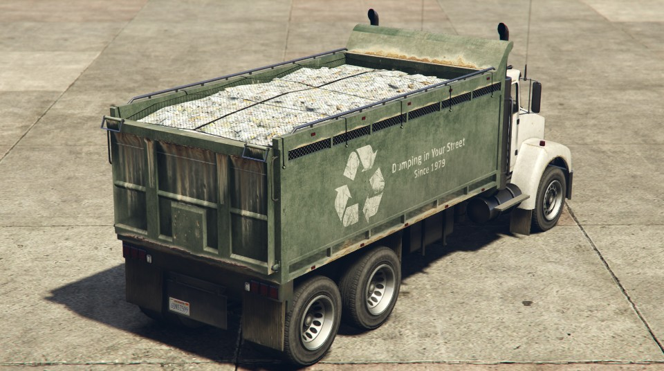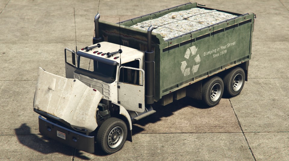 Unlike in GTA IV, the truck is only available in a single configuration, a dump container with marker lights on the upper and lower sides, silver frames on the upper borders of the side walls and a pile of trash covered by a mesh screen tied to the side hooks of the container. It also bears a recycling logo on it.