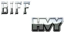 The Biff is depicted as a conventional cab truck similar to the Flatbed in terms of size and base configuration. The front of the vehicle features a large heavy-duty bumper with an open section on the center and slightly-angled outer sections. The front of the nose is finished in silver/chrome and features a large grille with horizontal separations and a slanted top with a small intake near the windshield, while the sides of the nose have large rounded fenders for the front wheels, housing rectangular headlights, square-shaped amber indicators near the cabin and rear mudflaps. The same nose features the HVY logo above the grille.