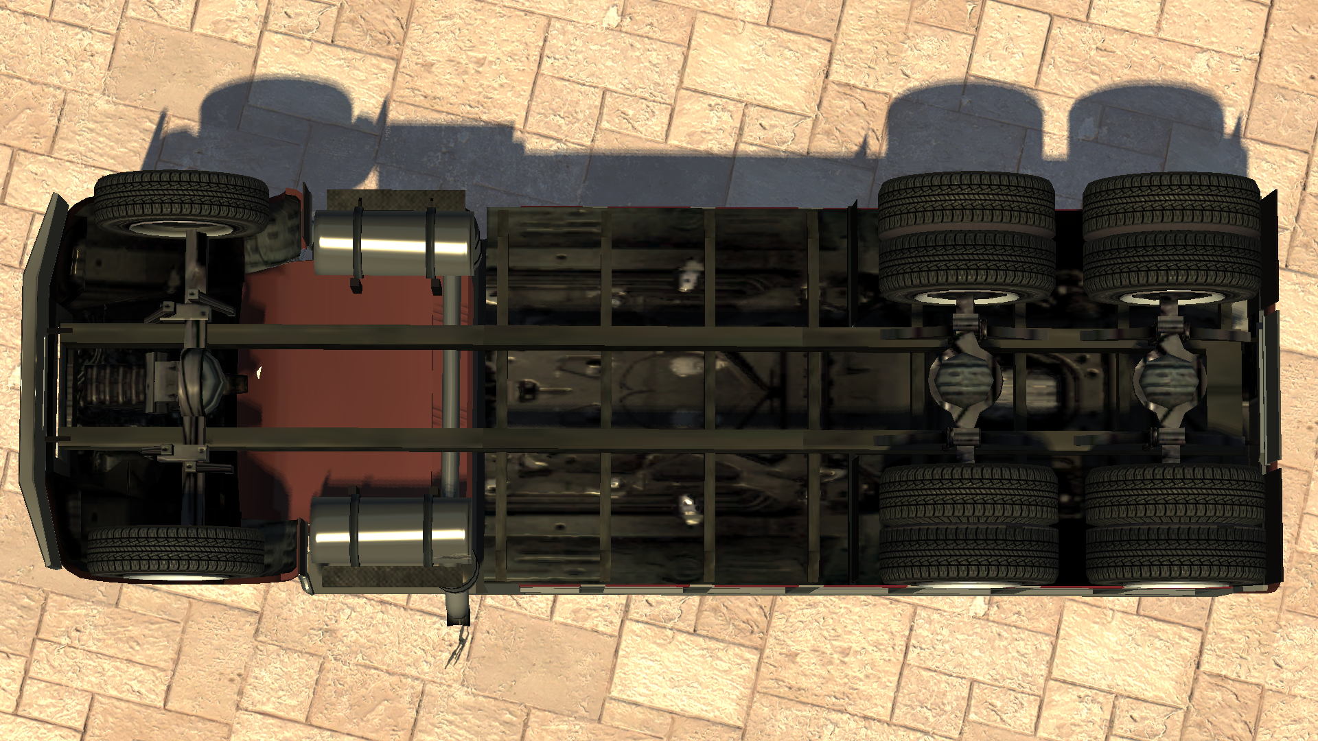 The Biff is powered by what appears to be a V8, judging by its cover, which is coupled to a 5-speed gearbox in a front engine, rear wheel drive layout. Strangely, the model has a rather underscaled appearance, being smaller than those found on trucks like the Phantom and the Flatbed. It shares the engine sound with the Trashmaster and the Ripley, being not as smooth as the Mule's, but not as loud as the Phantom's.
