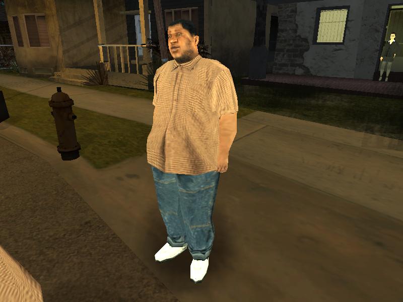 An unused model of him named Bb can be found in the game files[1]. This other model depicts a much fatter Big Bear, with slightly differently shaped facial features, but he is wearing the same clothes although it is never used in the game. It was probably going to be used in the beta Looking for Big Smoke mission. The used Big Bear model is called Bbthin in the game files, which suggests that Big Bear would have lost or gained weight during the storyline.