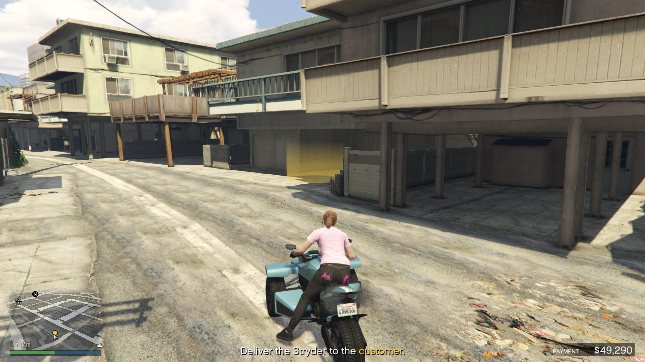 - Upon leaving the clubhouse, there may be a slight delay in world scenery solidifying. This can cause an issue with deliveries from some locations, such as the Rancho clubhouse, which requires waiting for a gate to open before leaving the yard; the gate may not immediately spawn and proceed to damage the bike when it does, if the player is driving out at the time and runs into it as it appears.