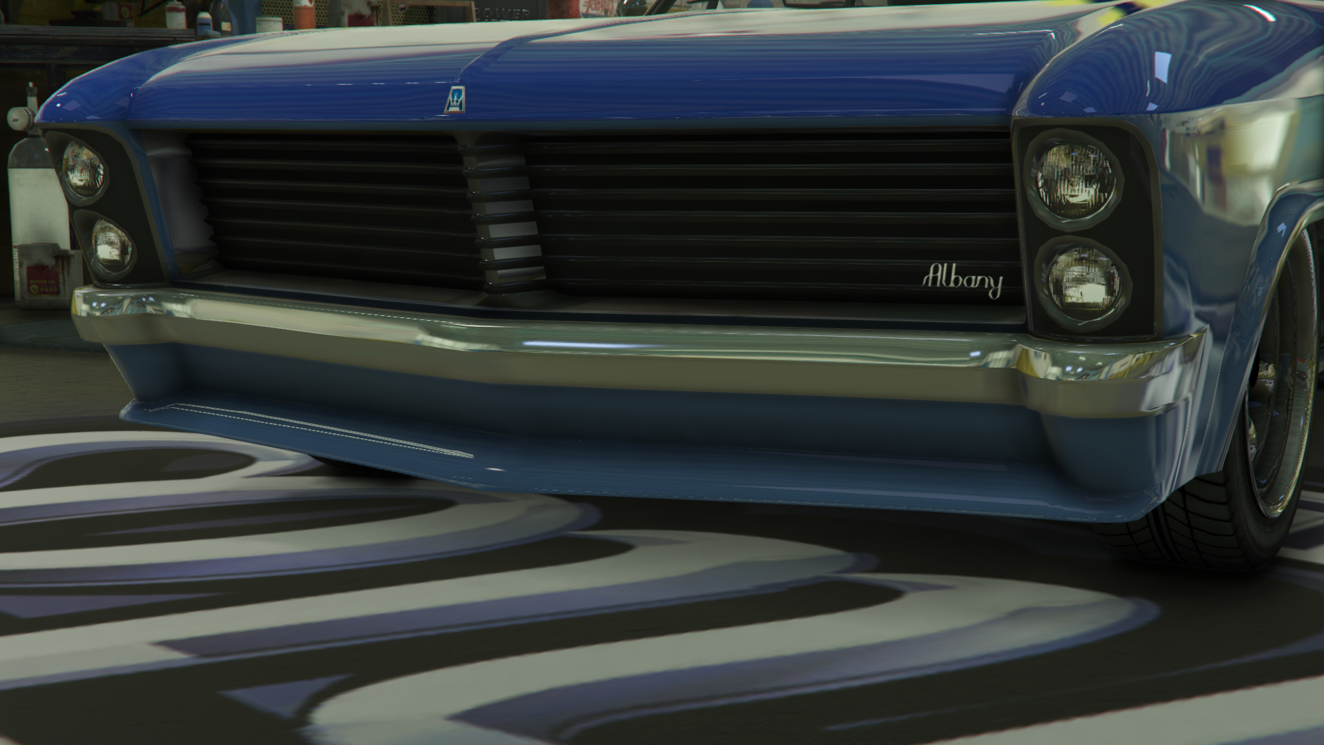 The Buccaneer's design is changed completely from GTA IV, featuring an older appearance with a raised rear suspension, giving it a dragster-like style. The front of the car is predominated by the split grille in the center, with the stacked circular headlights located on the outer edges and surrounded by chrome details and located in black housings. A chrome bumper spans the width of the car and follows the curvature of the outer edges.