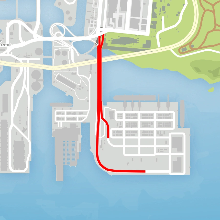 The road begins at Popular Street in Cypress Flats in the north and ends at the port's dock and container storage yard in the Terminal, in the southeast. It also has connections to Hanger Way and Chum Street.