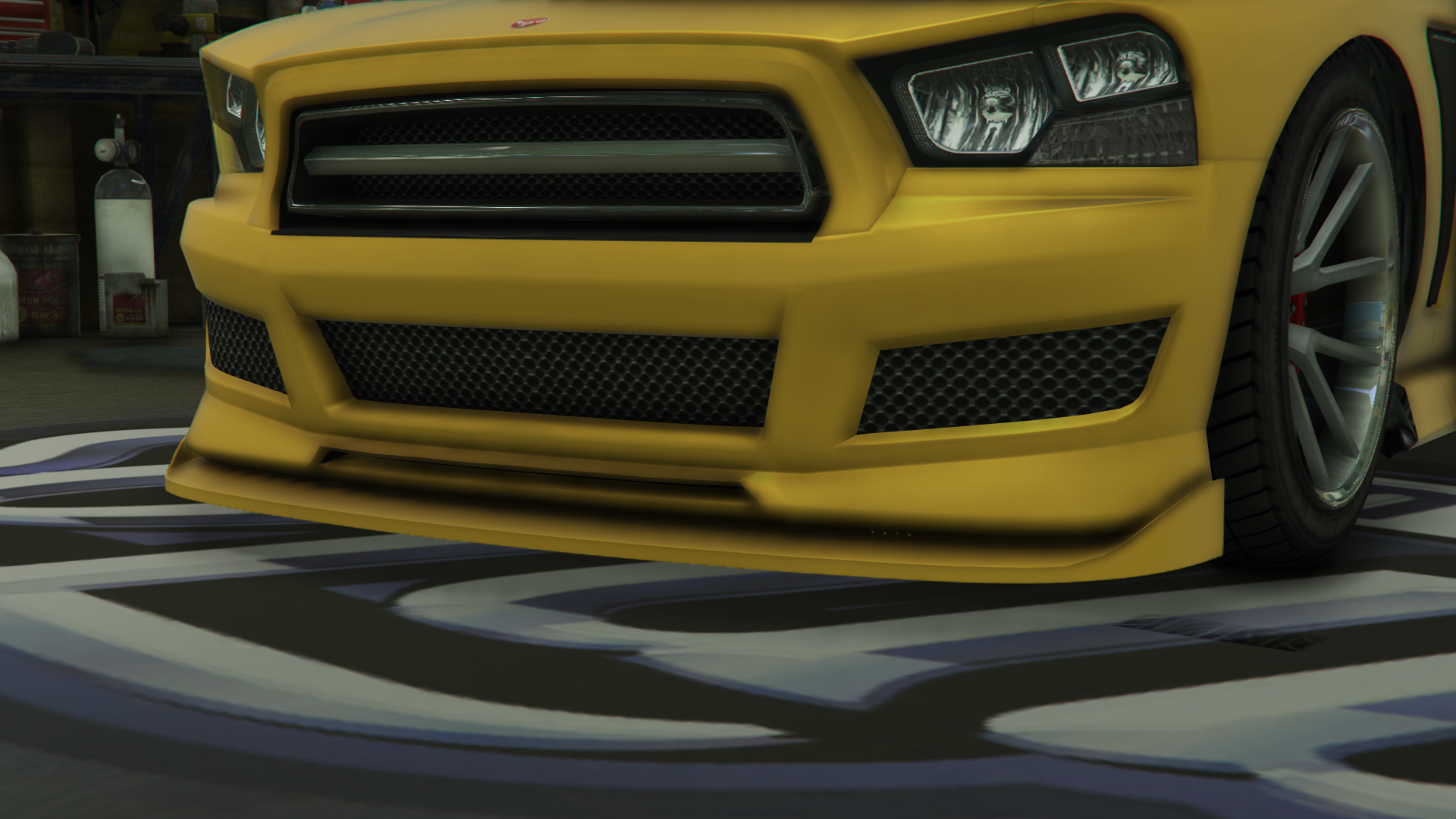 The car is prominently painted in a primary color for the body, with the hood bulge and roof painted in a secondary color. It uses a unique set of ten-spoke rims sharing a similar pattern to the "Mercie" sport rims seen in Los Santos Customs, with a more straighter appearance.