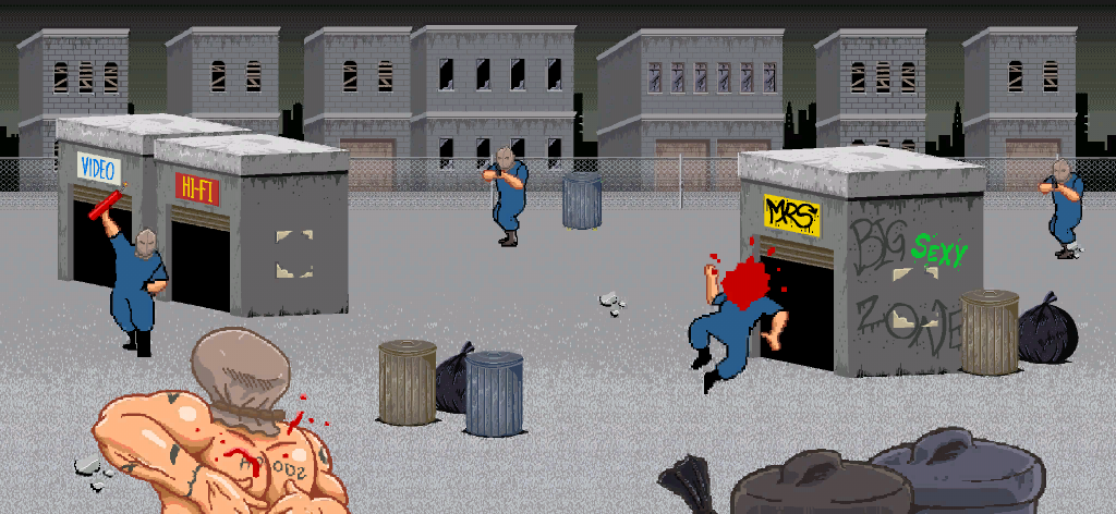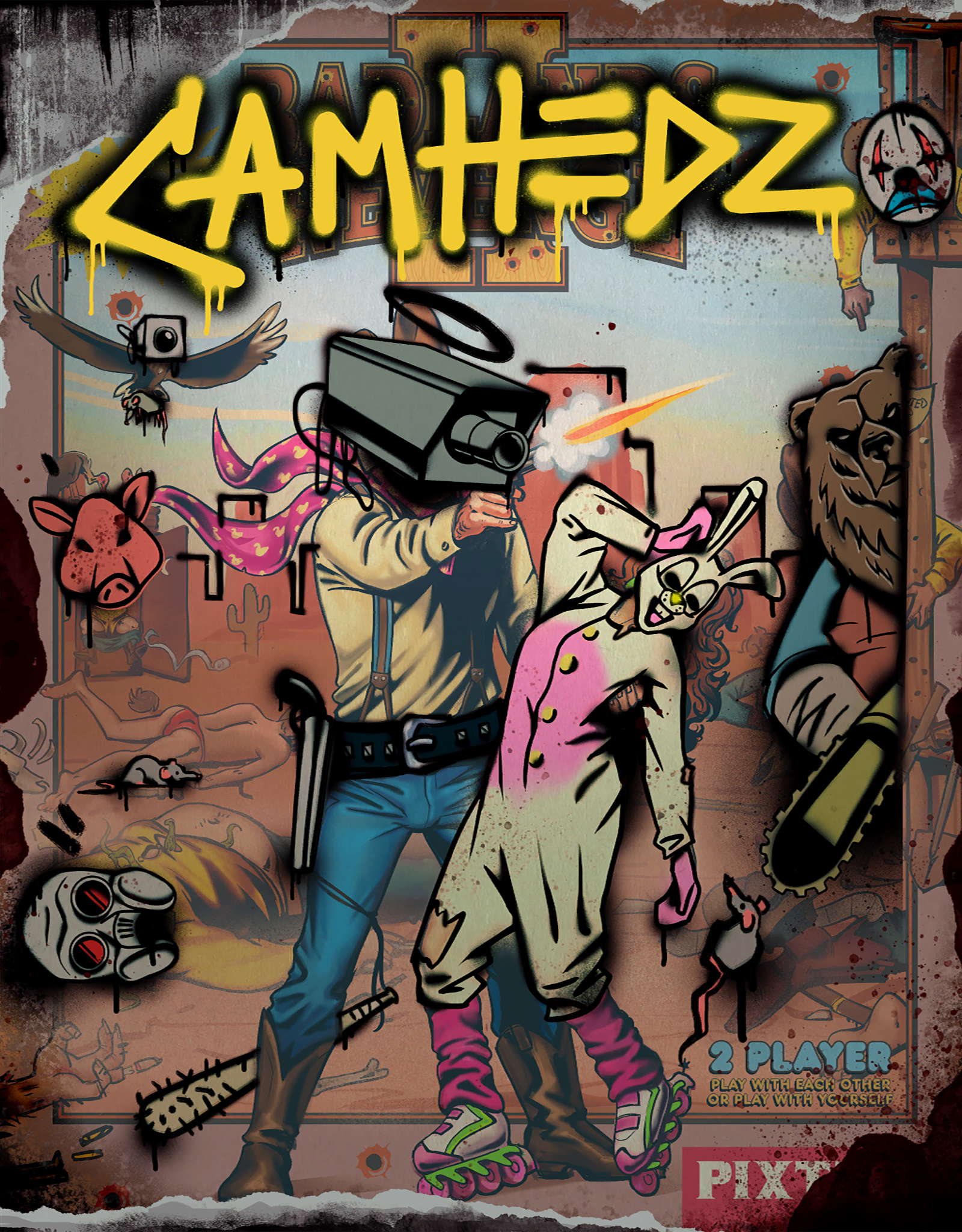 Similar to Badlands Revenge II, Camhedz requires the player going through a series of dystopian stages to eliminating enemies, and has pickups throughout each stage that can give health, invincibility, or other gun types. However, the game has several settings that differ from Badlands Revenge II, including: