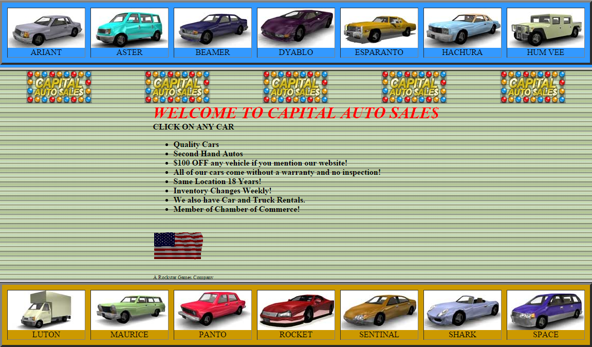 The Capital Autos website (http://www.rockstargames.com/grandtheftauto3/flash/capitalAutos/) is a teaser website created by Rockstar Games to promote GTA III. Interestingly, the site contains images and information of one of the earliest versions of the game. The models and names of the cars were very different from the final version of the game. There are also hidden cars, not seen in main page, such as early Taxi, Police, School Bus, Rhino, Bobcat etc.