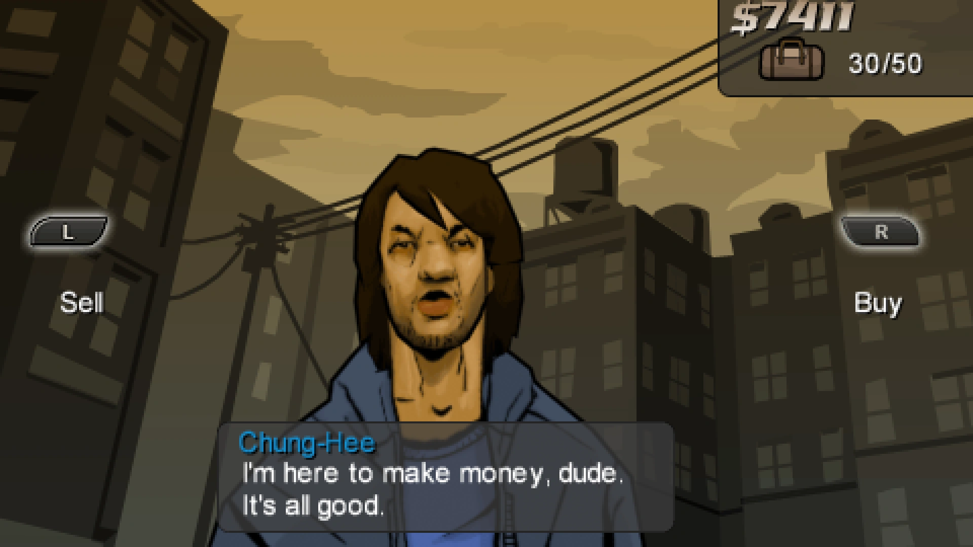 Chung-Hee shares his character appearance, dialogue and e-mail messages with all other Midtown Gangsters drug dealers. In the original Nintendo DS release, all drug dealers lack unique appearances, appearing offscreen during the deals.